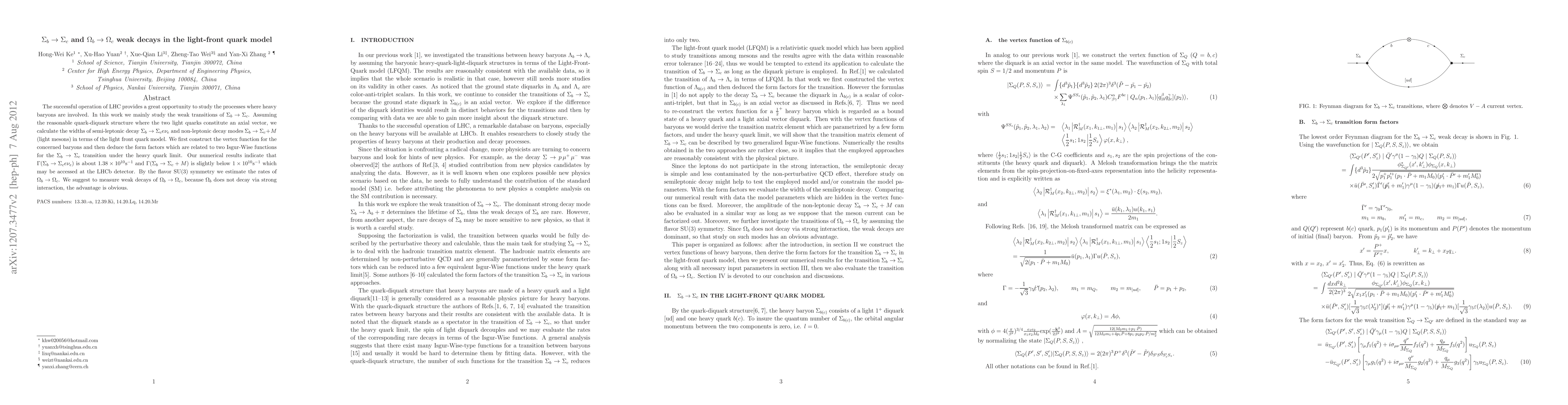 The successful operation of LHC provides a great opportunity to study the processes where heavy baryons are involved. {In this work we mainly study} the weak transitions of $\Sigma_b\to \Sigma_c$. Assuming the reasonable quark-diquark structure where the two light quarks constitute an axial vector, we calculate the widths of semi-leptonic decay $\Sigma_{b}\to\Sigma_c e\nu_e$ and non-leptonic decay modes $\Sigma_{b}\to\Sigma_c +M$ (light mesons) in terms of the light front quark model. We first construct the vertex function for the concerned baryons and then deduce the form factors which are related to two Isgur-Wise functions for the $\Sigma_{b}\to\Sigma_c$ transition under the heavy quark limit. Our numerical results indicate that $\Gamma(\Sigma_{b}\to\Sigma_c e\nu_e)$ is about $1.38\times10^{10}{\rm s}^{-1}$ and $\Gamma(\Sigma_{b}\to\Sigma_c +M)$ is slightly below $1\times10^{10}{\rm s}^{-1}$ which may be accessed at the LHCb detector. By the flavor SU(3) symmetry we estimate the rates of $\Omega_b\to\Omega_c$. We suggest to measure weak decays of $\Omega_b\to\Omega_c$, because $\Omega_b$ does not decay via strong interaction, the advantage is obvious.