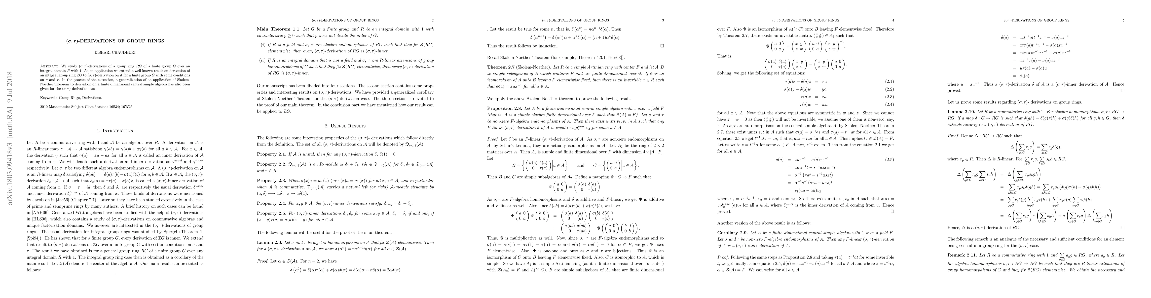 This paper investigates $(\sigma,\tau)$-derivations of group rings $RG$ for finite groups $G$ over integral domains $R$, extending known results for $\Bbb{Z}G$ derivations to $(\sigma,\tau)$-derivations under specific conditions on $\sigma$ and $\tau$, and generalizes Skolem-Noether Theorem applications for finite dimensional central simple algebras in this context.