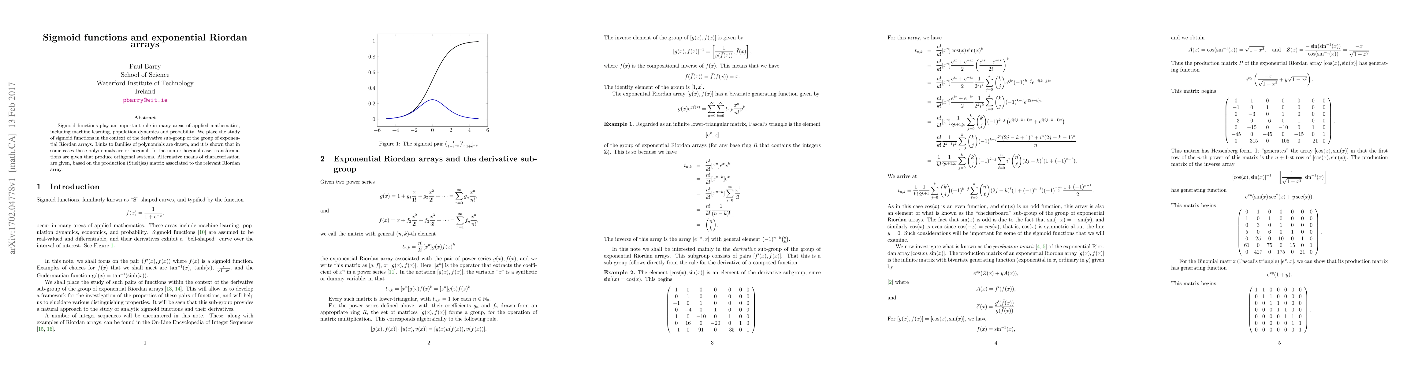 Sigmoid functions play an important role in many areas of applied mathematics, including machine learning, population dynamics and probability. We place the study of sigmoid functions in the context of the derivative sub-group of the group of exponential Riordan arrays. Links to families of polynomials are drawn, and it is shown that in some cases these polynomials are orthogonal. In the non-orthogonal case, transformations are given that produce orthgonal systems. Alternative means of characterisation are given, based on the production (Stieltjes) matrix associated to the relevant Riordan array.