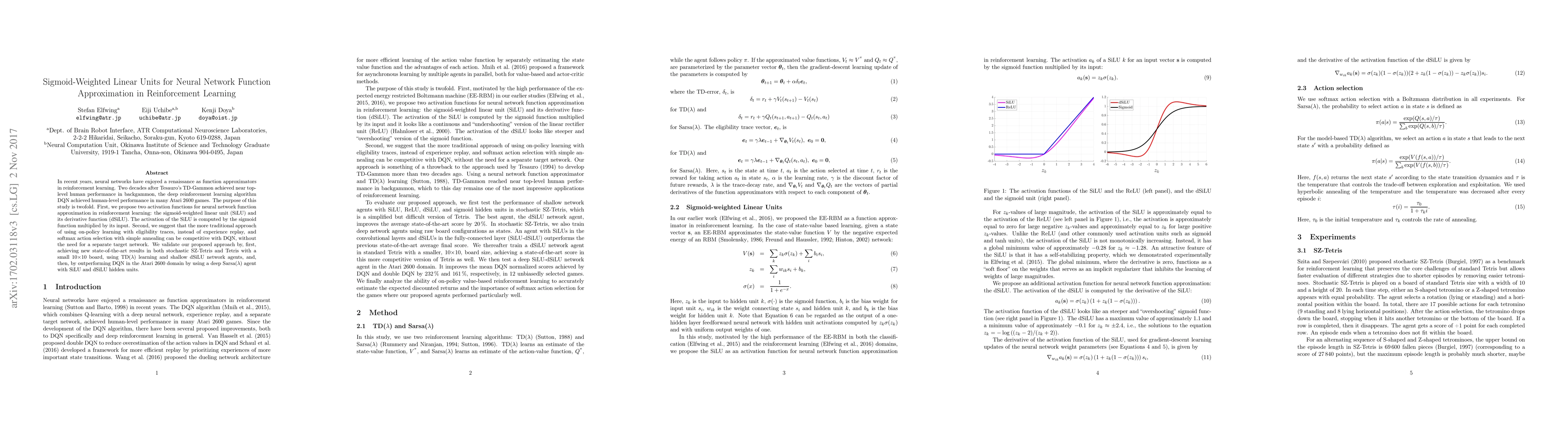 This paper proposes the sigmoid-weighted linear unit (SiLU) and its derivative dSiLU for neural network function approximation in reinforcement learning. It also suggests on-policy learning with eligibility traces as a competitive alternative to DQN, achieving state-of-the-art results in Tetris and outperforming DQN in Atari 2600 games.