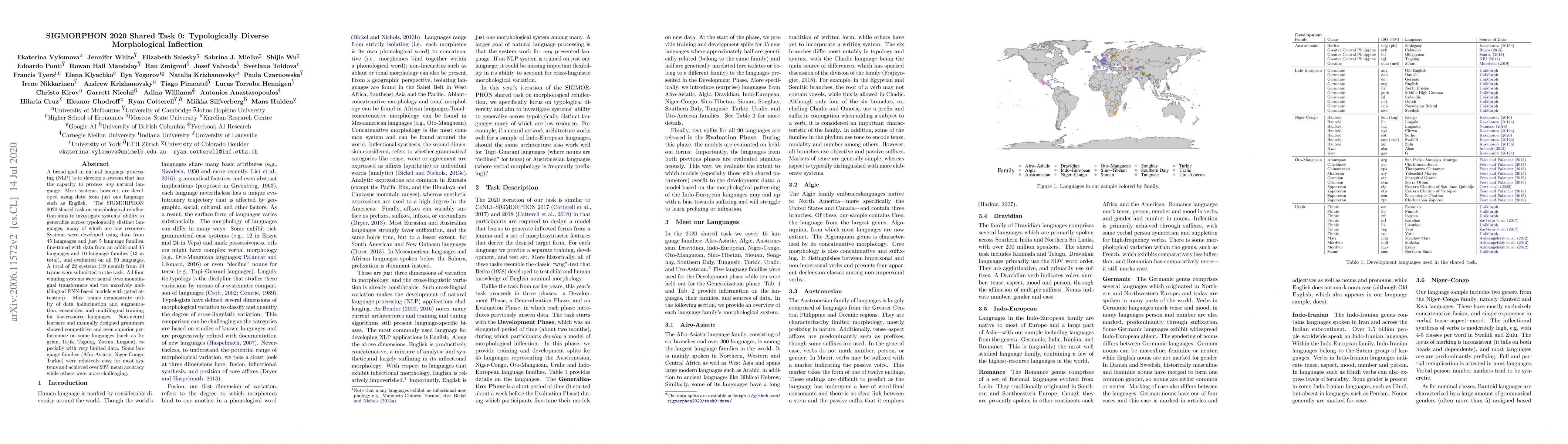 The SIGMORPHON 2020 shared task evaluated neural and non-neural systems' ability to generalize morphological inflection across 90 typologically diverse languages. Neural models, especially those with multilingual training, performed best overall, while non-neural methods and manually designed grammars excelled in low-resource languages.