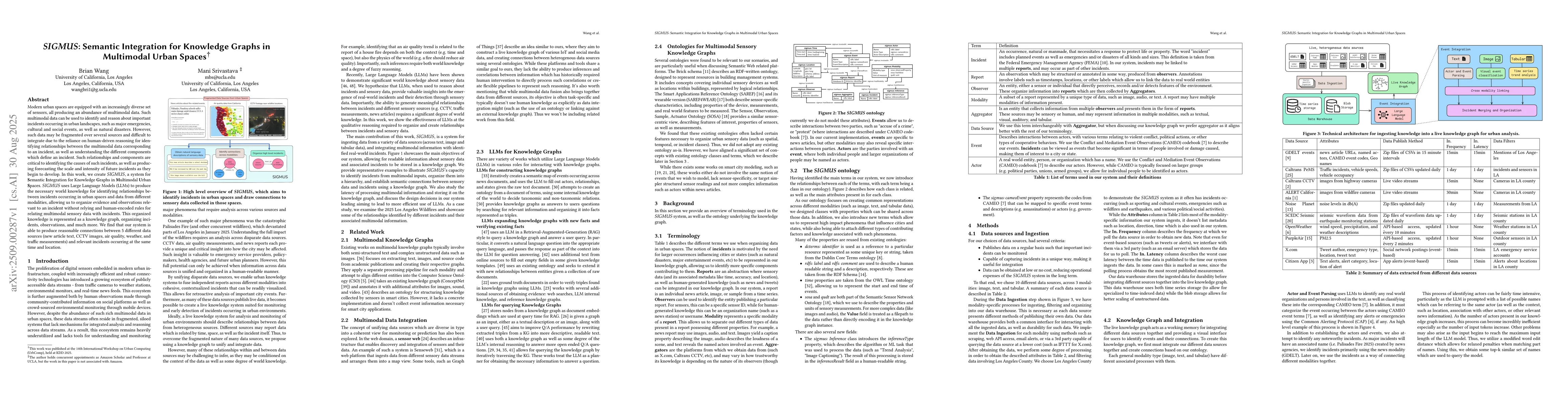 Modern urban spaces are equipped with an increasingly diverse set of sensors, all producing an abundance of multimodal data. Such multimodal data can be used to identify and reason about important incidents occurring in urban landscapes, such as major emergencies, cultural and social events, as well as natural disasters. However, such data may be fragmented over several sources and difficult to integrate due to the reliance on human-driven reasoning for identifying relationships between the multimodal data corresponding to an incident, as well as understanding the different components which define an incident. Such relationships and components are critical to identifying the causes of such incidents, as well as producing forecasting the scale and intensity of future incidents as they begin to develop. In this work, we create SIGMUS, a system for Semantic Integration for Knowledge Graphs in Multimodal Urban Spaces. SIGMUS uses Large Language Models (LLMs) to produce the necessary world knowledge for identifying relationships between incidents occurring in urban spaces and data from different modalities, allowing us to organize evidence and observations relevant to an incident without relying and human-encoded rules for relating multimodal sensory data with incidents. This organized knowledge is represented as a knowledge graph, organizing incidents, observations, and much more. We find that our system is able to produce reasonable connections between 5 different data sources (new article text, CCTV images, air quality, weather, and traffic measurements) and relevant incidents occurring at the same time and location.