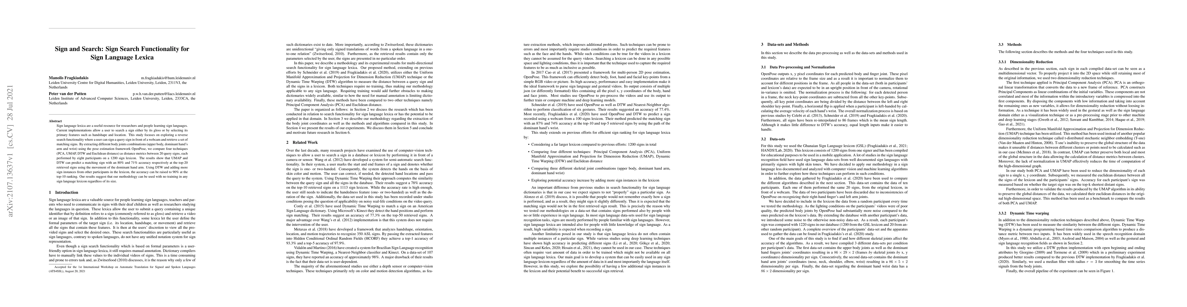 Sign language lexica are a useful resource for researchers and people learning sign languages. Current implementations allow a user to search a sign either by its gloss or by selecting its primary features such as handshape and location. This study focuses on exploring a reverse search functionality where a user can sign a query sign in front of a webcam and retrieve a set of matching signs. By extracting different body joints combinations (upper body, dominant hand's arm and wrist) using the pose estimation framework OpenPose, we compare four techniques (PCA, UMAP, DTW and Euclidean distance) as distance metrics between 20 query signs, each performed by eight participants on a 1200 sign lexicon. The results show that UMAP and DTW can predict a matching sign with an 80\% and 71\% accuracy respectively at the top-20 retrieved signs using the movement of the dominant hand arm. Using DTW and adding more sign instances from other participants in the lexicon, the accuracy can be raised to 90\% at the top-10 ranking. Our results suggest that our methodology can be used with no training in any sign language lexicon regardless of its size.