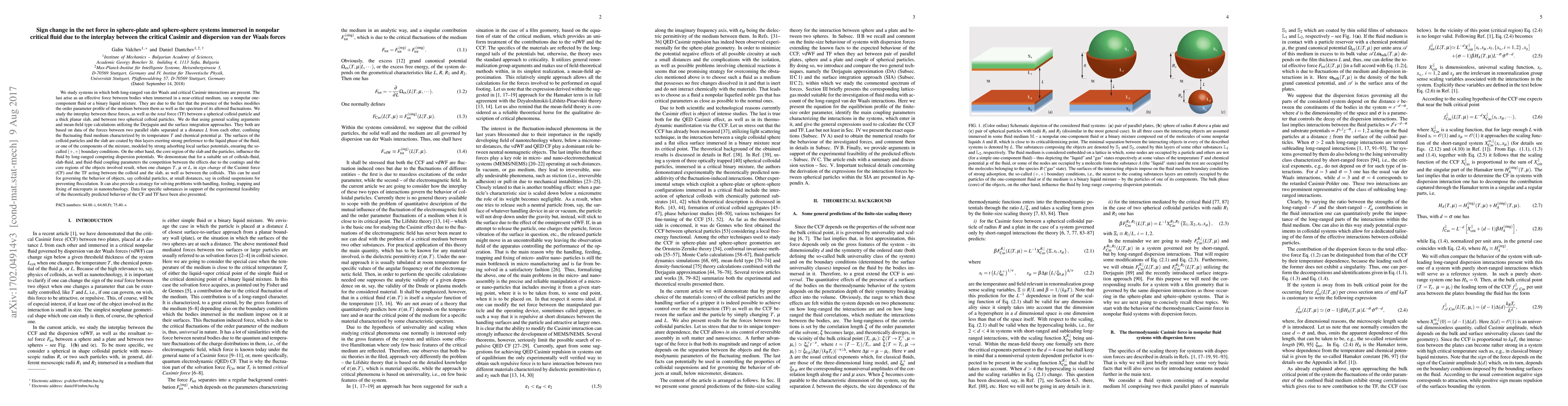 We study systems in which both long-ranged van der Waals and critical Casimir interactions are present. We study the interplay between these forces, as well as the {\it total} force (TF) between a spherical colloid particle and a thick planar slab, and between two spherical colloid particles. We do that using general scaling arguments and mean-field type calculations utilizing the Derjaguin and the surface integration approaches. They both are based on data of the forces between two parallel slabs separated at a distance $L$ from each other, confining the fluctuating fluid medium characterized by its temperature $T$ and chemical potential $\mu$. The surfaces of the colloid particles and the slab are coated by thin layers exerting strong preference to the liquid phase of the fluid, or one of the components of the mixture, modeled by strong adsorbing local surface potentials, ensuring the so-called $(+,+)$ boundary conditions. On the other hand, the core region of the slab and the particles, influence the fluid by long-ranged competing dispersion potentials. We demonstrate that for a suitable set of colloids-fluid, slab-fluid, and fluid-fluid coupling parameters the competition between the effects due to the coatings and the core regions of the objects involved result, when one changes $T$, $\mu$ or $L$, in {\it sign change} of the Casimir force (CF) {\it and} the TF acting between the colloid and the slab, as well as between the colloids. This can be used for governing the behavior of objects, say colloidal particles, at small distances, say in colloid suspensions for preventing flocculation. It can also provide a strategy for solving problems with handling, feeding, trapping and fixing of microparts in nanotechnology. Data for specific substances in support of the experimental feasibility of the theoretically predicted behavior of the CF and TF have been also presented.