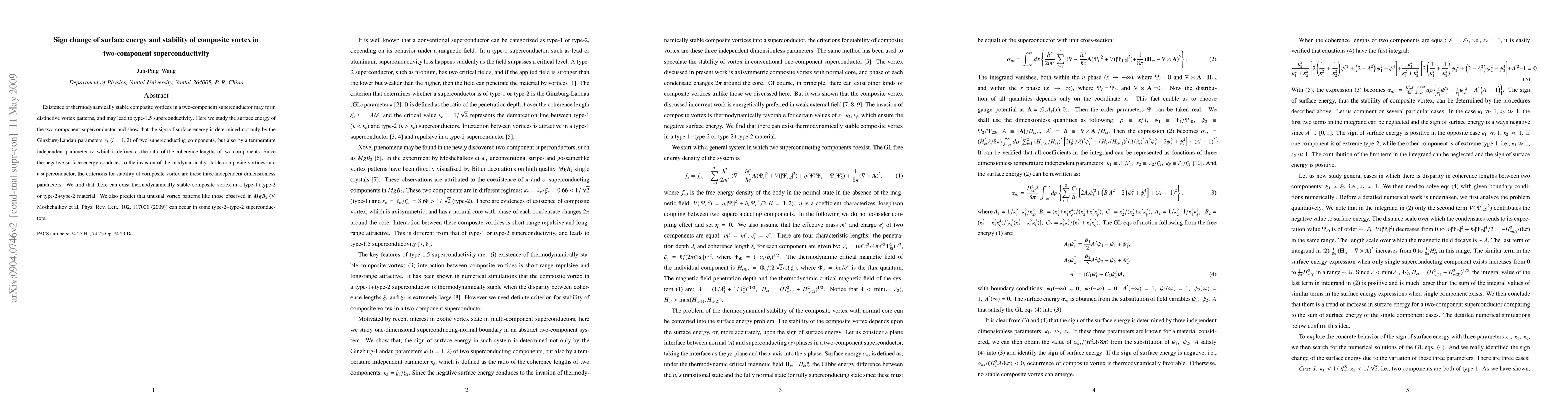 This paper investigates the stability of composite vortices in two-component superconductors, showing that surface energy sign is influenced by the Ginzburg-Landau parameters and the coherence length ratio. It predicts the existence of stable composite vortices in type-1+type-2 or type-2+type-2 materials, potentially leading to unusual vortex patterns.