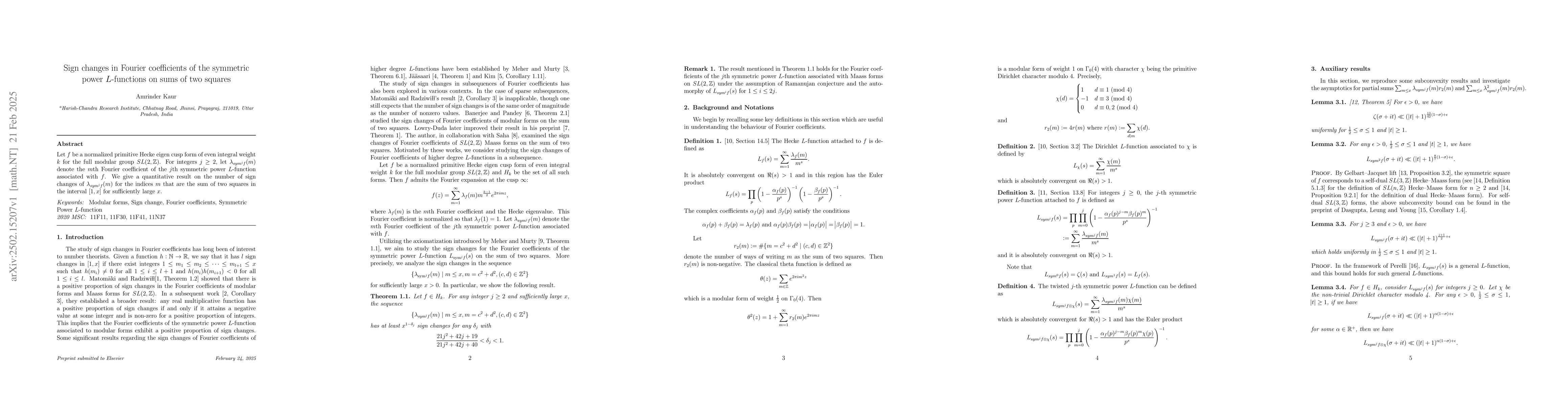 The paper presents a novel quantitative analysis of sign changes in Fourier coefficients of symmetric power $L$-functions associated with specific cusp forms, providing bounds for sums of two squares in large intervals.