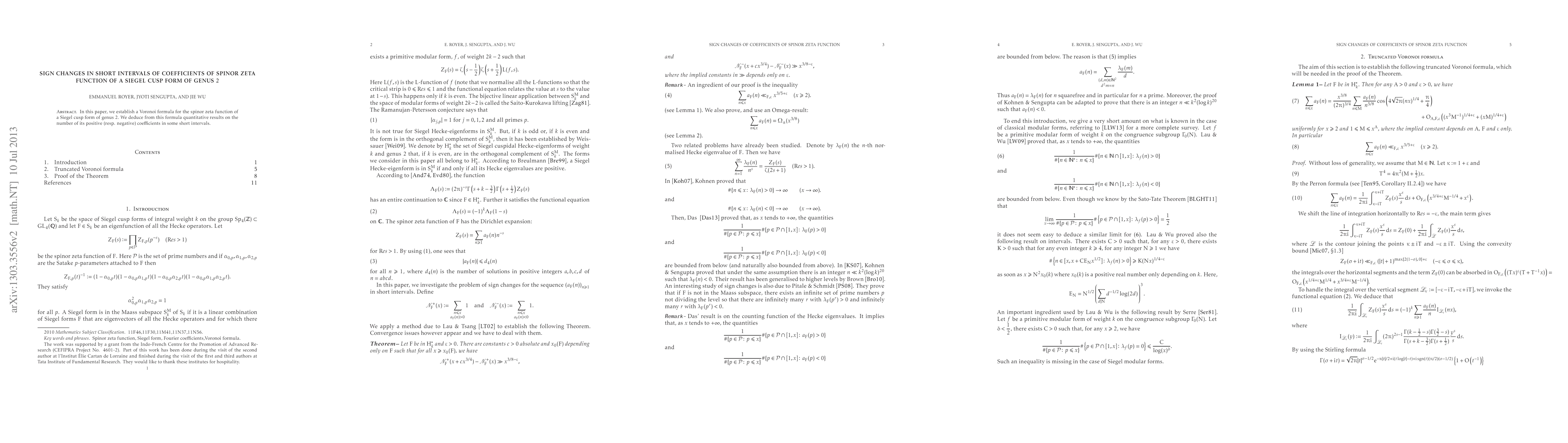 Summary: This research develops a Voronoi formula for the spinor zeta function of a genus 2 Siegel cusp form and uses it to quantify the number of positive and negative coefficients within short intervals.