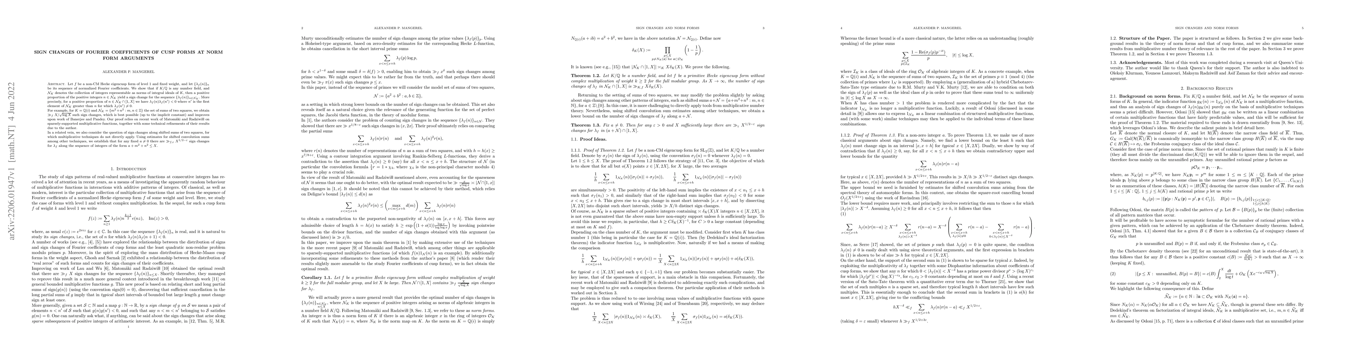 Let $f$ be a non-CM Hecke eigencusp form of level 1 and fixed weight, and let $\{\lambda_f(n)\}_n$ be its sequence of normalized Fourier coefficients. We show that if $K/ \mathbb{Q}$ is any number field, and $\mathcal{N}_K$ denotes the collection of integers representable as norms of integral ideals of $K$, then a positive proportion of the positive integers $n \in \mathcal{N}_K$ yield a sign change for the sequence $\{\lambda_f(n)\}_{n \in \mathcal{N}_K}$. More precisely, for a positive proportion of $n \in \mathcal{N}_K \cap [1,X]$ we have $\lambda_f(n)\lambda_f(n') < 0$ where $n'$ is the first element of $\mathcal{N}_K$ greater than $n$ for which $\lambda_f(n') \neq 0$. For example, for $K = \mathbb{Q}(i)$ and $\mathcal{N}_K = \{m^2+n^2 : m,n \in \mathbb{Z}\}$ the set of sums of two squares, we obtain $\gg_f X/\sqrt{\log X}$ such sign changes, which is best possible (up to the implicit constant) and improves upon work of Banerjee and Pandey. Our proof relies on recent work of Matom\"{a}ki and Radziwi\l\l{} on sparsely-supported multiplicative functions, together with some technical refinements of their results due to the author. In a related vein, we also consider the question of sign changes along shifted sums of two squares, for which multiplicative techniques do not directly apply. Using estimates for shifted convolution sums among other techniques, we establish that for any fixed $a \neq 0$ there are $\gg_{f,\epsilon} X^{1/2-\epsilon}$ sign changes for $\lambda_f$ along the sequence of integers of the form $a + m^2 + n^2 \leq X$.