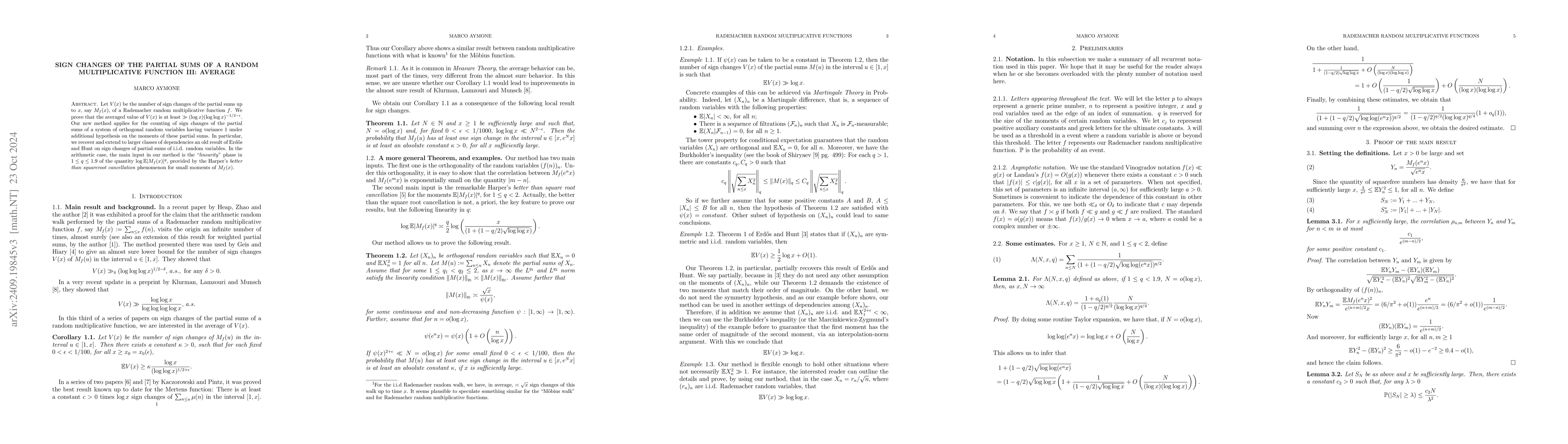 Let $V(x)$ be the number of sign changes of the partial sums up to $x$, say $M_f(x)$, of a Rademacher random multiplicative function $f$. We prove that the averaged value of $V(x)$ is at least $\gg (\log x)(\log\log x)^{-1/2-\epsilon}$. Our new method applies for the counting of sign changes of the partial sums of a system of orthogonal random variables having variance $1$ under additional hypothesis on the moments of these partial sums. In particular, we recover and extend to larger classes of dependencies an old result of Erd\H{o}s and Hunt on sign changes of partial sums of i.i.d. random variables. In the arithmetic case, the main input in our method is the ``\textit{linearity}'' phase in $1\leq q\leq 1.9$ of the quantity $\log \EE |M_f(x)|^q$, provided by the Harper's \textit{better than squareroot cancellation} phenomenon for small moments of $M_f(x)$.