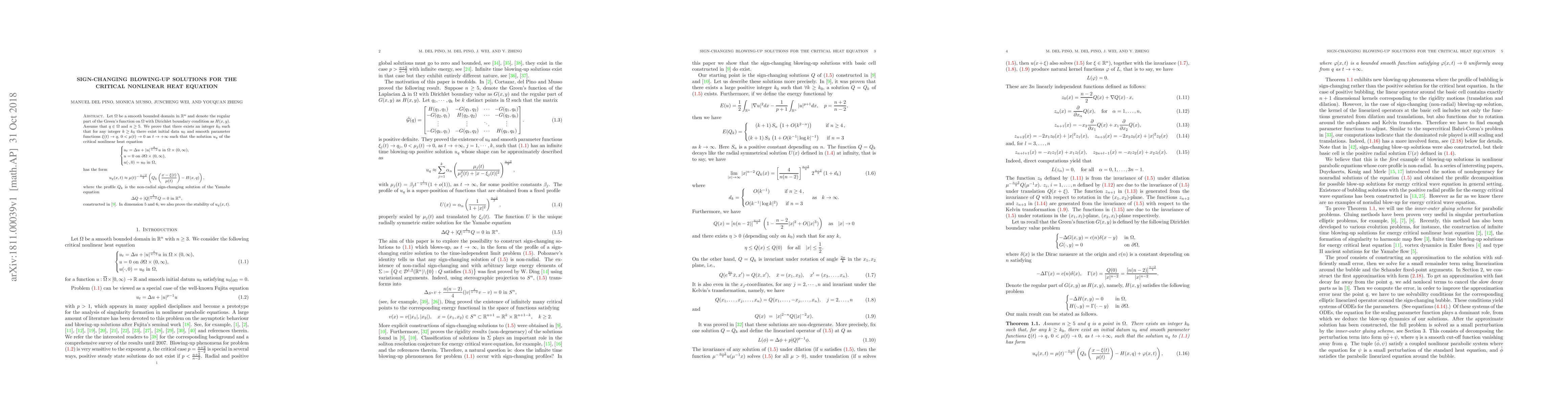This research identifies sign-changing blowing-up solutions for the critical nonlinear heat equation in high dimensions (n>=5), demonstrating their existence and form. The solutions are shown to resemble a profile based on non-radial sign-changing solutions of the Yamabe equation, scaled and translated, near a point q in the domain. The study also proves stability for these solutions in dimensions 5 and 6.