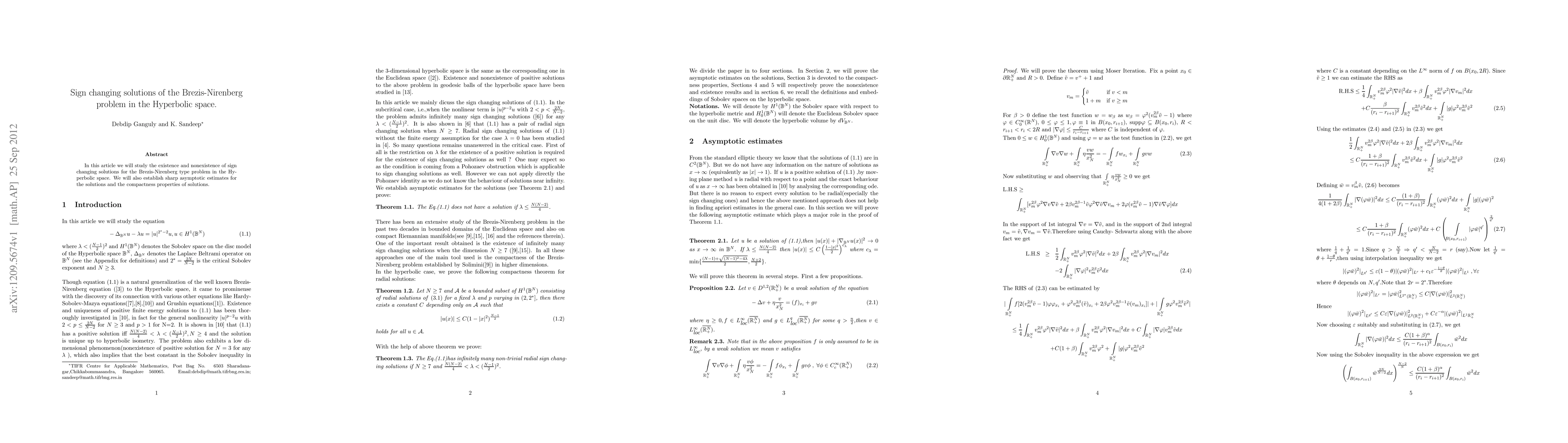 Title: Sign changing solutions of the Brezis-Nirenberg problem in the Hyperbolic space Summary: This paper investigates the existence and nonexistence of sign changing solutions for the Brezis-Nirenberg problem in hyperbolic space, along with establishing sharp asymptotic estimates and compactness properties of these solutions.