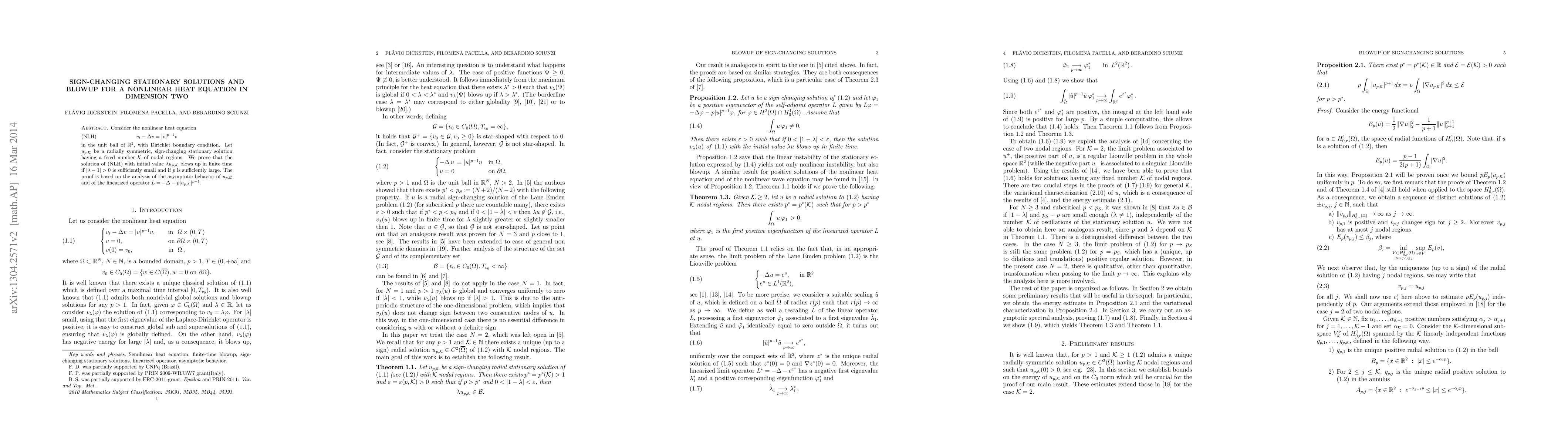 Consider the nonlinear heat equation v_t-\Delta v=|v|^{p-1}v in the unit ball of R^2, with Dirichlet boundary condition. Let u_{p,K} be a radially symmetric, sign-changing stationary solution having a fixed number K of nodal regions. We prove that the solution of the equation with initial value \lambda u_{p,K} blows up in finite time if |\lambda-1|>0 is sufficiently small and if p is sufficiently large. The proof is based on the analysis of the asymptotic behavior of $u_{p,K}$ and of the linearized operator L= -\Delta - p |u_{p,K}|^{p-1}. To show this we consider the linearized operator L= -\Delta - p|u_p|^{p-1} and study the behavior of its first eigenvalue and of its first normalized eigenfunction for large p.