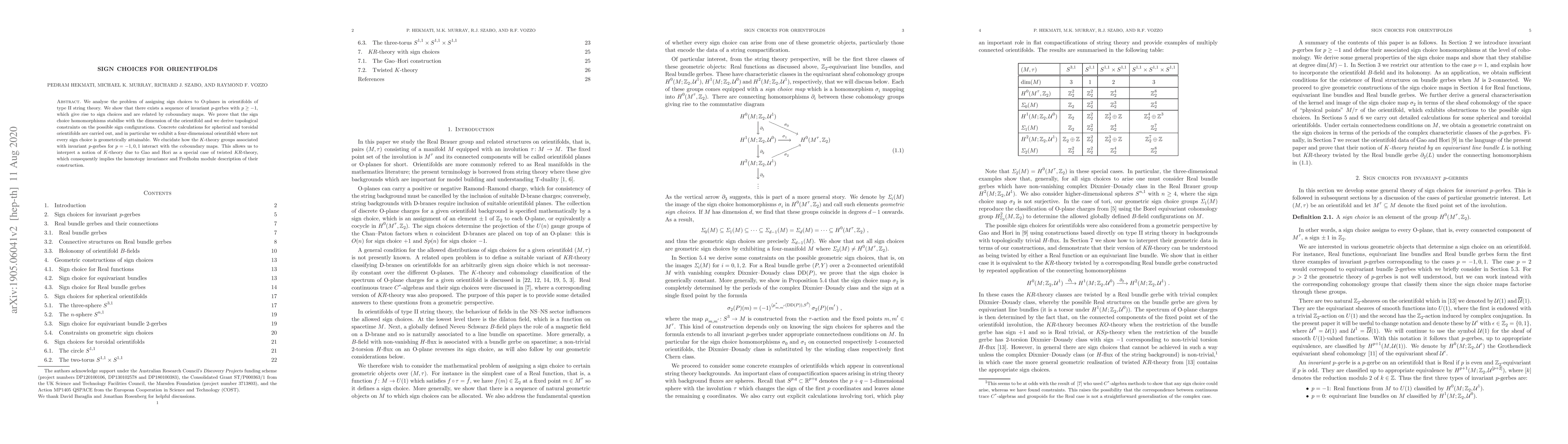 This research paper investigates the assignment of sign choices to O-planes in orientifolds of type II string theory. It identifies a sequence of invariant p-gerbes linked by coboundary maps and proves stabilization of sign choice homomorphisms with orientifold dimension. The study also presents topological constraints on sign configurations, with concrete examples for spherical and toroidal orientifolds, including a four-dimensional orientifold where not all sign choices are geometrically achievable. The paper further elucidates the relationship between K-theory groups and coboundary maps, interpreting Gao and Hori's K-theory notion as a special case of twisted KR-theory, implying homotopy invariance and Fredholm module description of their construction.