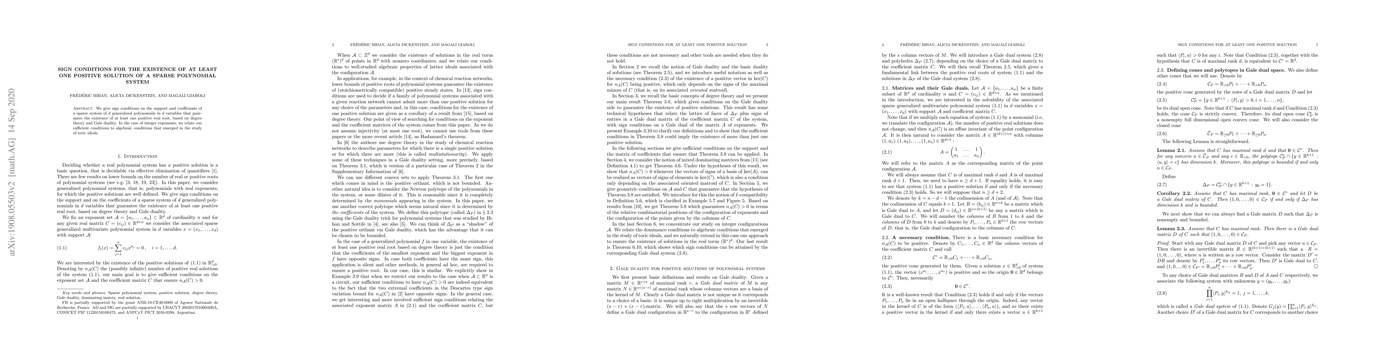 Summary: This paper presents sign conditions on the support and coefficients of a sparse polynomial system to ensure the existence of at least one positive real root, leveraging degree theory and Gale duality, and relates these conditions to algebraic properties of toric ideals in the case of integer exponents.