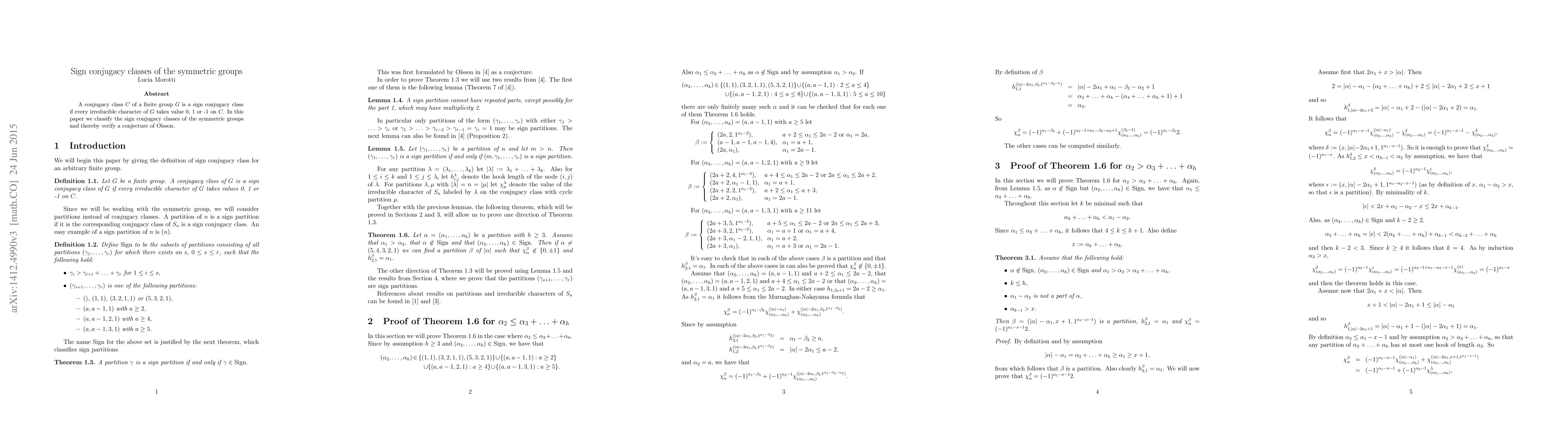 This paper classifies the sign conjugacy classes of symmetric groups, where a class exhibits values of 0, 1, or -1 for every irreducible character, thereby confirming a conjecture proposed by Olsson.