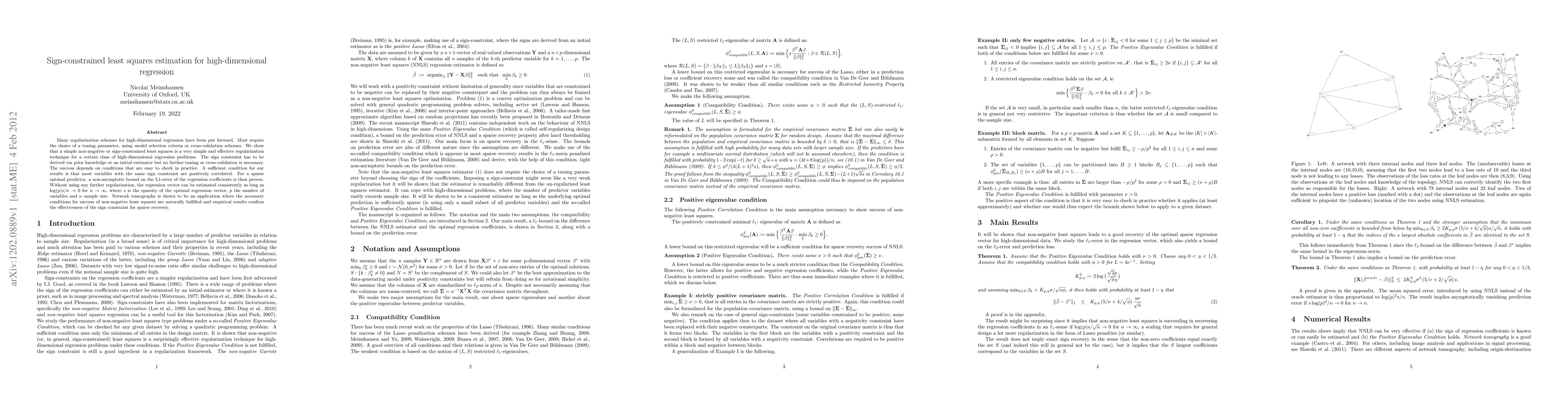 Many regularization schemes for high-dimensional regression have been put forward. Most require the choice of a tuning parameter, using model selection criteria or cross-validation schemes. We show that a simple non-negative or sign-constrained least squares is a very simple and effective regularization technique for a certain class of high-dimensional regression problems. The sign constraint has to be derived via prior knowledge or an initial estimator but no further tuning or cross-validation is necessary. The success depends on conditions that are easy to check in practice. A sufficient condition for our results is that most variables with the same sign constraint are positively correlated. For a sparse optimal predictor, a non-asymptotic bound on the L1-error of the regression coefficients is then proven. Without using any further regularization, the regression vector can be estimated consistently as long as \log(p) s/n -> 0 for n -> \infty, where s is the sparsity of the optimal regression vector, p the number of variables and n sample size. Network tomography is shown to be an application where the necessary conditions for success of non-negative least squares are naturally fulfilled and empirical results confirm the effectiveness of the sign constraint for sparse recovery.
