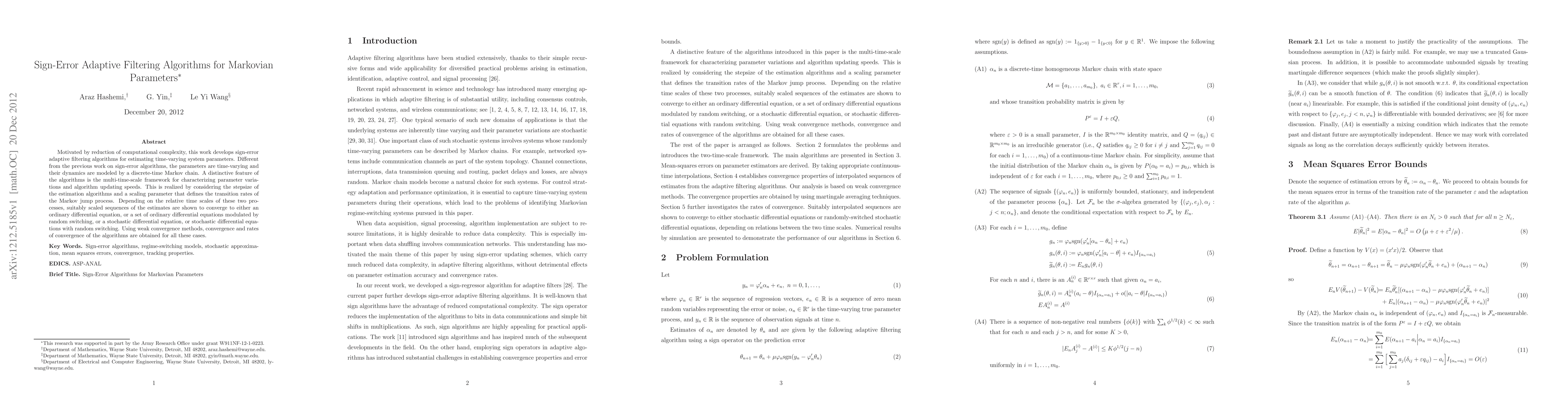 This paper develops sign-error adaptive filtering algorithms for estimating time-varying system parameters modeled by a discrete-time Markov chain, employing a multi-time-scale framework to characterize parameter variations and algorithm updating speeds. The algorithms' convergence and rates are analyzed using weak convergence methods for different scenarios.