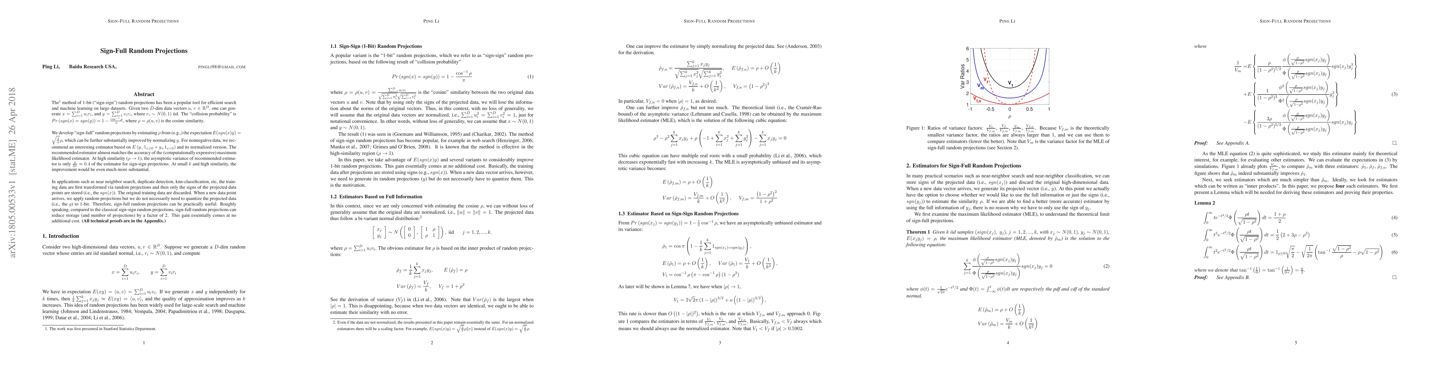 This paper introduces "sign-full" random projections, which estimate cosine similarity between data vectors more accurately than traditional "sign-sign" projections. It proposes a computationally efficient estimator that nearly matches the accuracy of the maximum likelihood estimator, especially for high similarity data, with significantly reduced variance.
