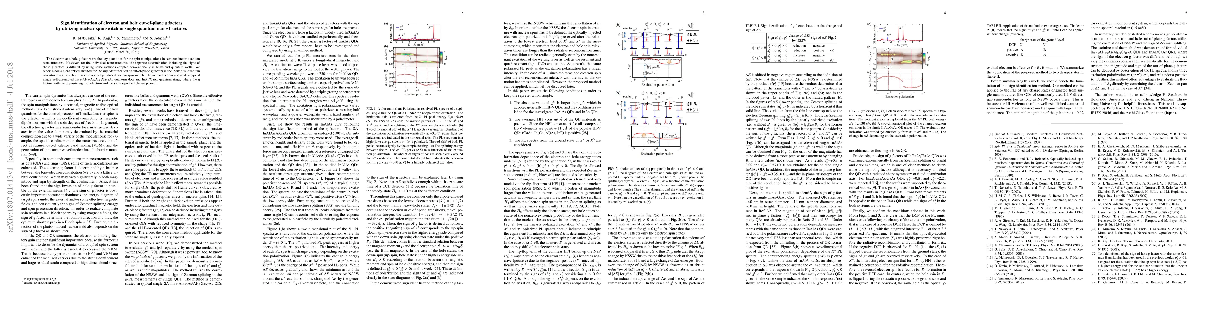 The electron and hole g factors are the key quantities for the spin manipulations in semiconductor quantum nanostructures. However, for the individual nanostructures, the separate determination including the signs of those g factors is difficult by using some methods adopted conventionally in bulks and quantum wells. We report a convenient optical method for the sign identification of out-of-plane g factors in the individual quantum nanostructures, which utilizes the optically-induced nuclear spin switch. The method is demonstrated in typical single self-assembled In$_{0.75}$Al$_{0.25}$As/Al$_{0.3}$Ga$_{0.7}$As quantum dots and InAs/GaAs quantum rings, where the g factors with the opposite sign for electron and the same sign for hole are proved.