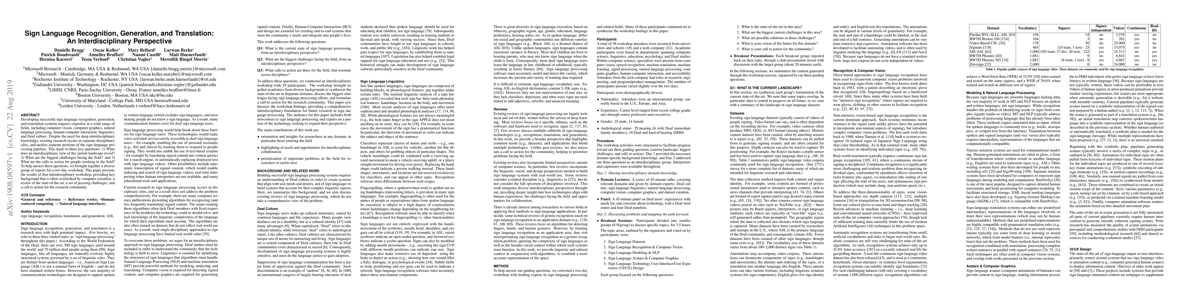This paper synthesizes insights from an interdisciplinary workshop on sign language recognition, generation, and translation, highlighting the need for collaboration across computer vision, natural language processing, and linguistics to address current challenges and foster advancements in the field.