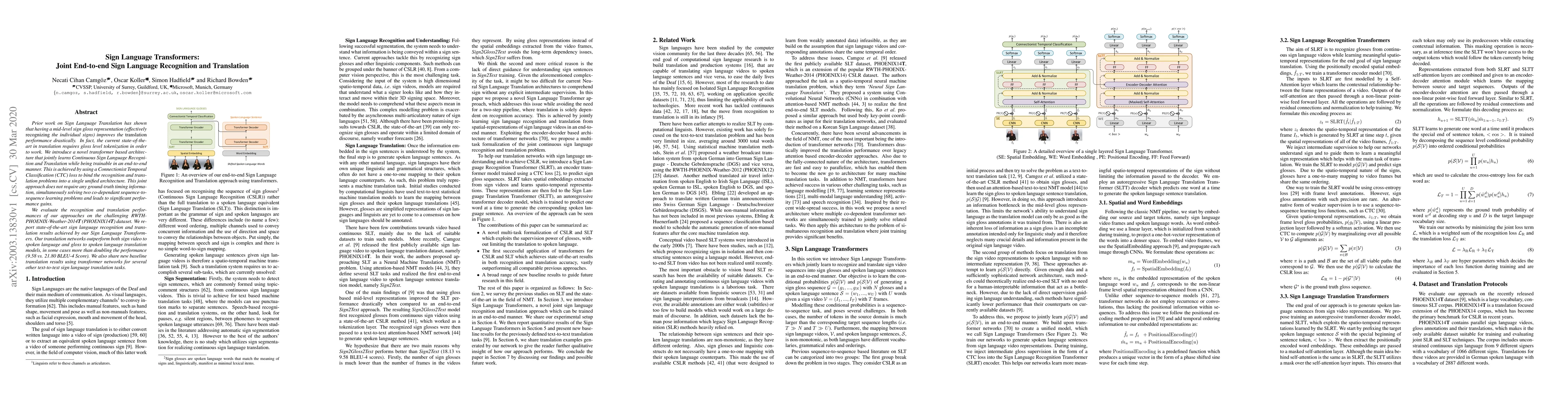 This paper introduces a transformer-based architecture for joint end-to-end sign language recognition and translation, achieving state-of-the-art results on the PHOENIX14T dataset. The proposed method uses a Connectionist Temporal Classification (CTC) loss to unify the recognition and translation tasks, leading to significant performance improvements.