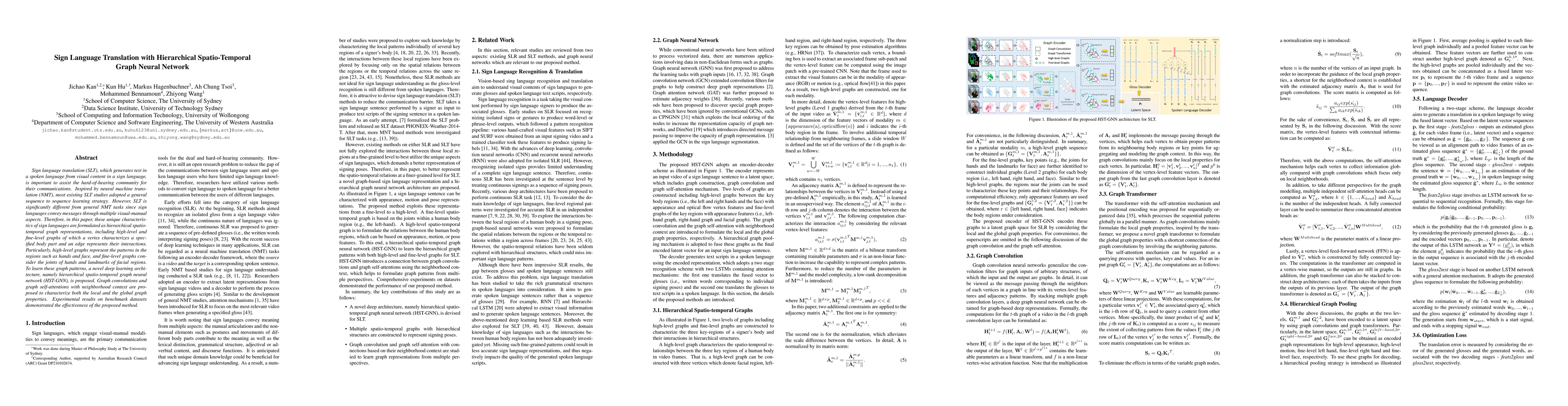 This paper proposes a hierarchical spatio-temporal graph neural network (HST-GNN) to translate sign language into text, addressing the unique visual-manual aspects of sign languages. The method uses hierarchical graph representations to model high-level and fine-level interactions of body parts, achieving superior performance over traditional sequence-to-sequence models.