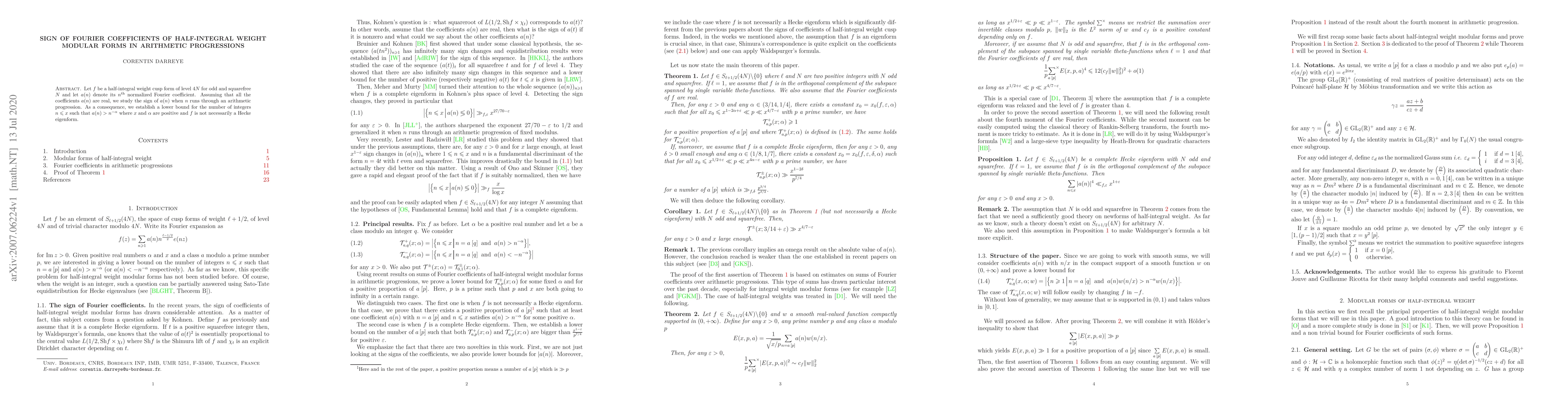 Let $f$ be a half-integral weight cusp form of level $4N$ for odd and squarefree $N$ and let $a(n)$ denote its $n^{\rm th}$ normalized Fourier coefficient. Assuming that all the coefficients $a(n)$ are real, we study the sign of $a(n)$ when $n$ runs through an arithmetic progression. As a consequence, we establish a lower bound for the number of integers $n\le x$ such that $a(n)>n^{-\alpha}$ where $x$ and $\alpha$ are positive and $f$ is not necessarily a Hecke eigenform.