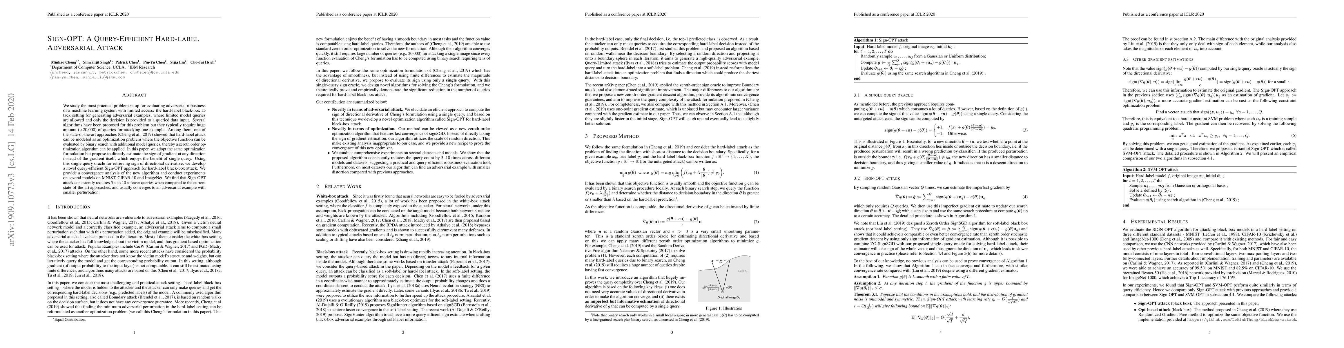 This paper introduces Sign-OPT, a novel query-efficient adversarial attack method for hard-label black-box settings, which estimates the sign of the gradient instead of the gradient itself, significantly reducing the number of required queries. Experiments show that Sign-OPT requires 5X to 10X fewer queries compared to state-of-the-art methods while often achieving smaller perturbations.