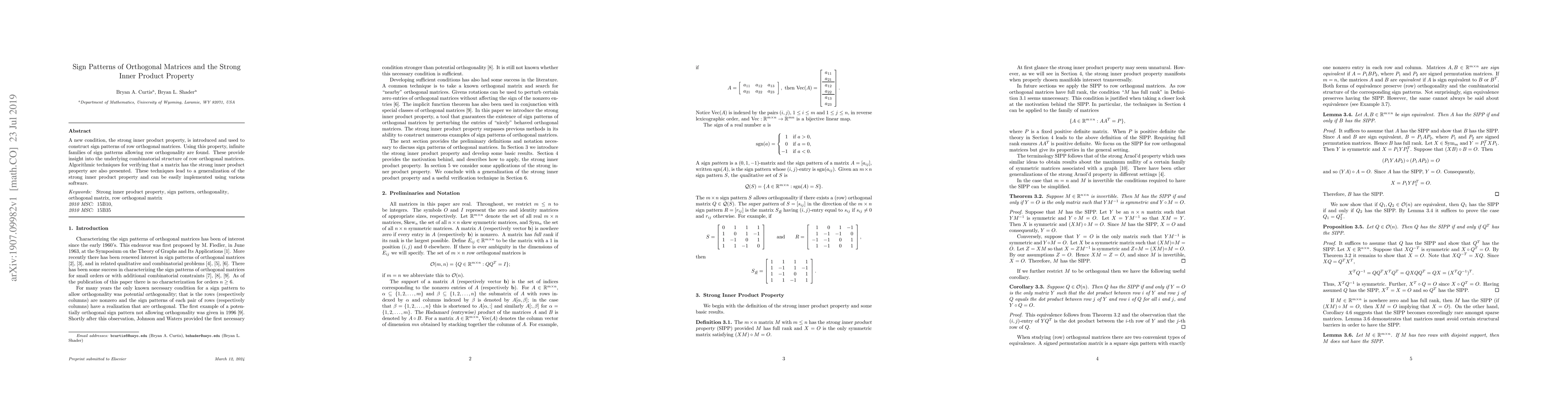 Researchers introduce a new condition for row orthogonal matrices, known as the strong inner product property, to create infinite families of sign patterns allowing row orthogonality. This discovery provides insight into the combinatorial structure of these matrices and enables algorithmic verification of the property.