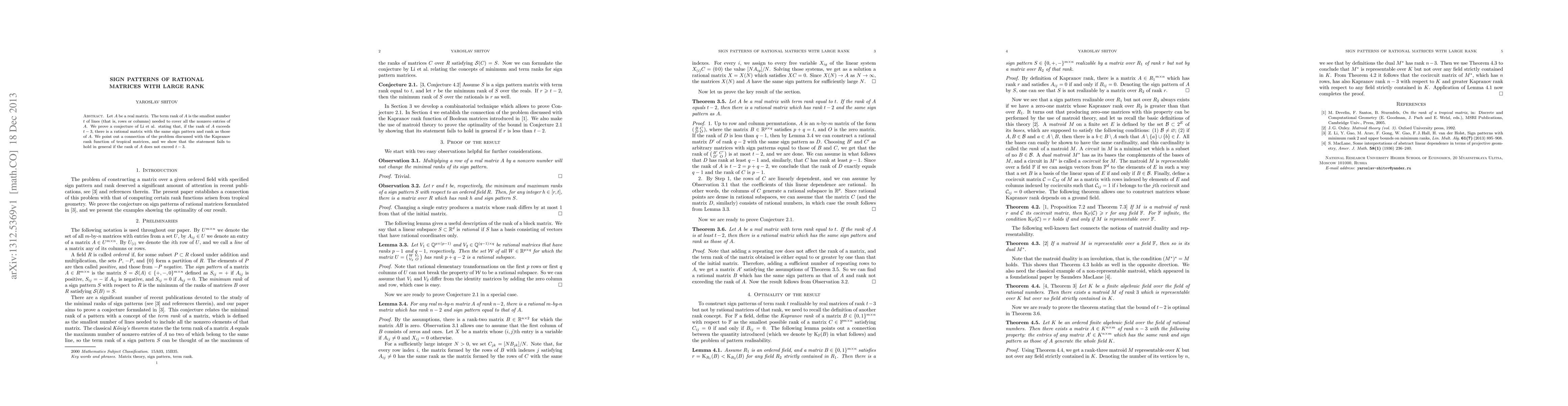 Let $A$ be a real matrix. The term rank of $A$ is the smallest number $t$ of lines (that is, rows or columns) needed to cover all the nonzero entries of $A$. We prove a conjecture of Li et al. stating that, if the rank of $A$ exceeds $t-3$, there is a rational matrix with the same sign pattern and rank as those of $A$. We point out a connection of the problem discussed with the Kapranov rank function of tropical matrices, and we show that the statement fails to hold in general if the rank of $A$ does not exceed $t-3$.