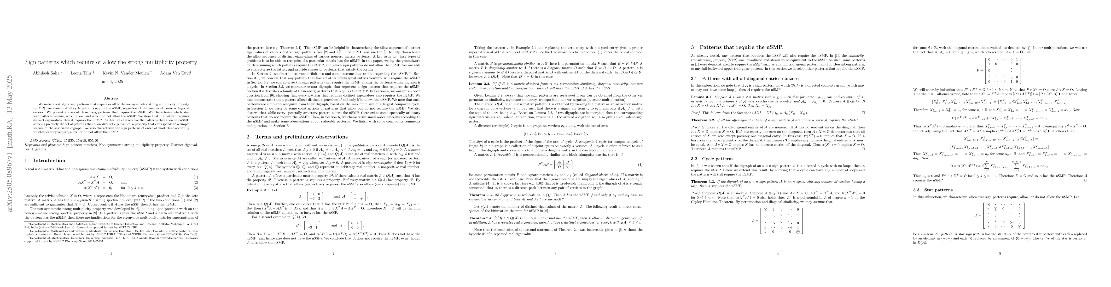 The paper presents characterizations and classifications of sign patterns according to their relationship with the nSMP, extending previous work on multiplicity properties in matrix theory.