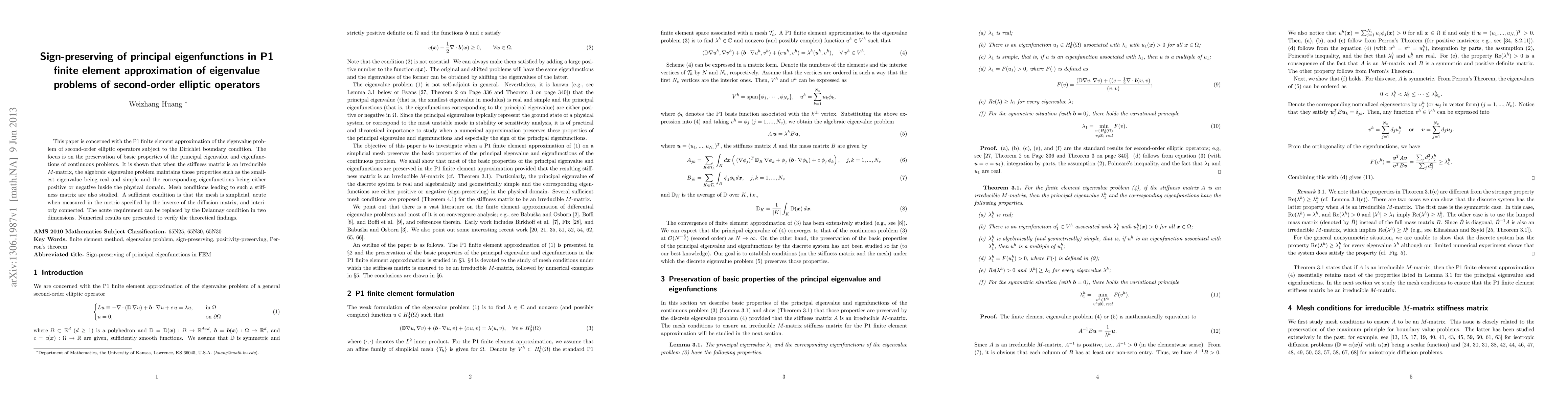 This research demonstrates that in P1 finite element approximation of eigenvalue problems for second-order elliptic operators, under specific mesh conditions, the principal eigenvalue's real and simple nature, along with the positivity or negativity of eigenfunctions within the domain, are preserved. These conditions include an irreducible $M$-matrix stiffness, a simplicial and acute (or Delaunay in 2D) mesh, and interior connectivity.