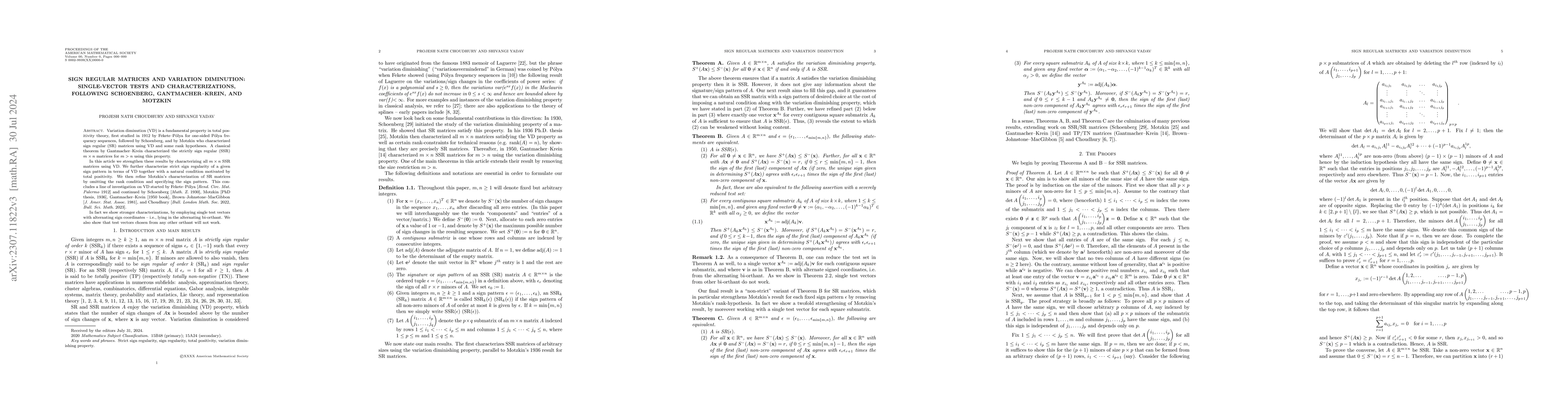 Variation diminution (VD) is a fundamental property in total positivity theory, first studied by Fekete-P\'olya (1912) for one sided P\'olya frequency sequences, followed by Schoenberg (1930), and by Motzkin (1936) who characterized sign regular (SR) matrices using VD and some rank hypotheses. A classical theorem in 1950 by Gantmacher-Krein characterized the strictly sign regular (SSR) $m \times n$ matrices for $m>n$ using this property. In this article we strengthen their result by characterizing all $m \times n$ SSR matrices using VD. We further characterize strict sign regularity of a given sign pattern in terms of VD together with a natural condition motivated by total positivity. We then refine Motzkin's characterization of SR matrices by omitting the rank condition and specifying the sign pattern. More strongly, these characterizations employ single test vectors with alternating sign coordinates - i.e., lying in an alternating bi-orthant. The second contribution of our work includes the study of linear preservers of SR and SSR matrices. The linear preserver problem is an important question in matrix theory and operator theory. We classify all linear mappings $\mathcal{L}:\mathbb{R}^{m\times n}\to\mathbb{R}^{m\times n}$ that preserve: (i) sign regularity and (ii) sign regularity with a given sign pattern, as well as strict versions of these.
