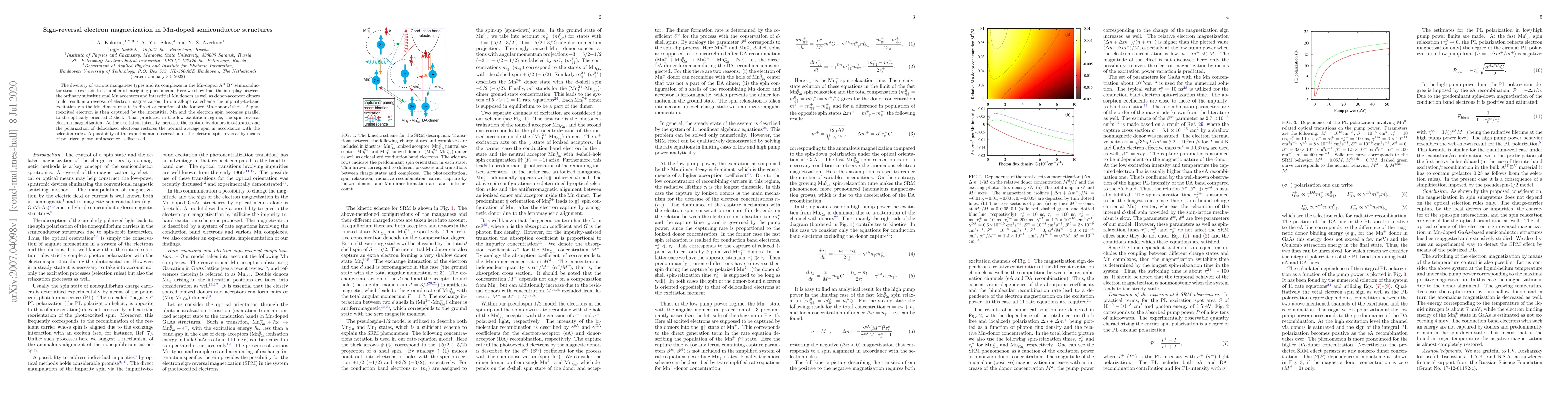 This paper investigates the phenomenon of sign-reversal electron magnetization in Mn-doped semiconductor structures, demonstrating that the interplay between substitutional Mn acceptors and interstitial Mn donors can lead to spin-reversal electron magnetization under low excitation conditions. The study proposes an all-optical method for observing this effect via polarized photoluminescence.
