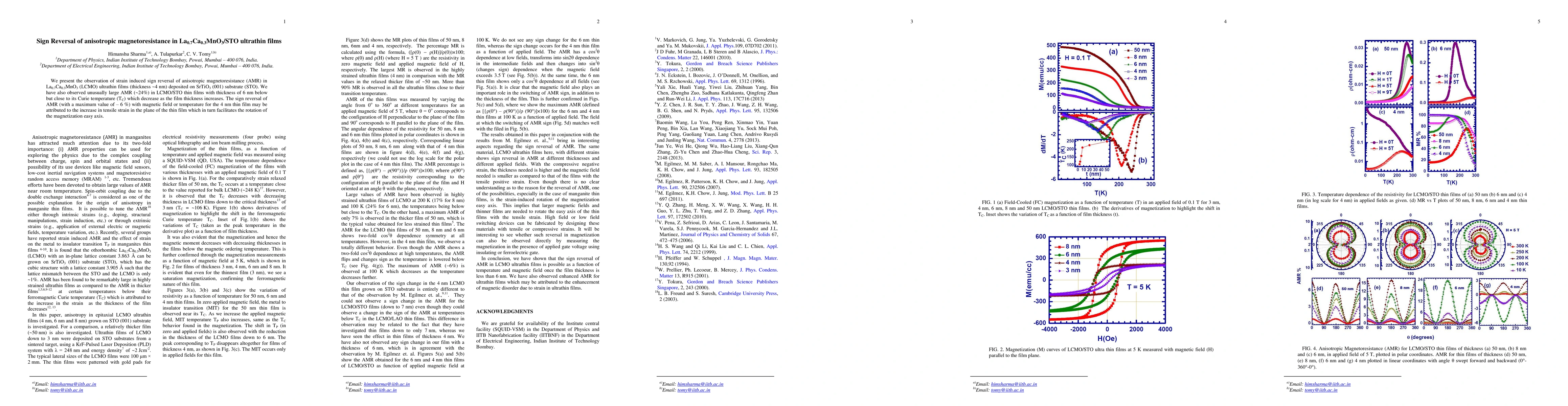 We present the observation of strain induced sign reversal of anisotropic magnetoresistance (AMR) in LCMO (LCMO) ultrathin films (thickness 4 nm) deposited on STO (001) substrate (STO). We have also observed unusually large AMR in LCMO/STO thin films with thickness of 6 nm below but close to its Curie temperature (TC) which decrease as the film thickness increases. The sign reversal of AMR (with a maximum value of - 6) with magnetic field or temperature for the 4 nm thin film may be attributed to the increase in tensile strain in the plane of the thin film which in turn facilitates the rotation of the magnetization easy axis.