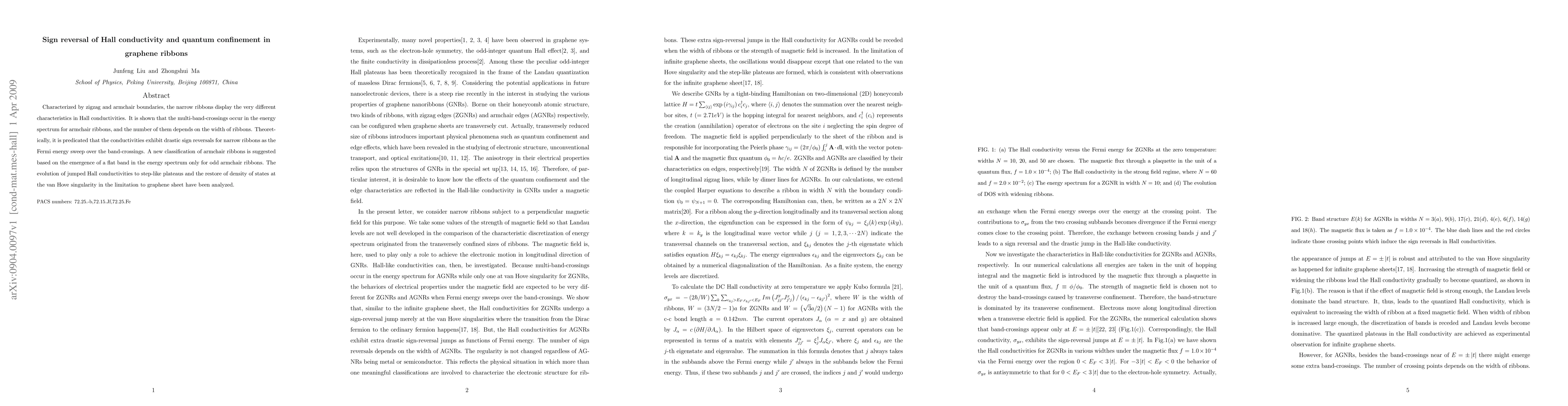 Characterized by zigzag and armchair boundaries, the narrow ribbons display the very different characteristics in Hall conductivities. It is shown that the multi-band-crossings occur in the energy spectrum for armchair ribbons, and the number of them depends on the width of ribbons. Theoretically, it is predicated that the conductivities exhibit drastic sign reversals for narrow ribbons as the Fermi energy sweep over the band-crossings. A new classification of armchair ribbons is suggested based on the emergence of a flat band in the energy spectrum only for odd armchair ribbons. The evolution of jumped Hall conductivities to step-like plateaus and the restore of density of states at the van Hove singularity in the limitation to graphene sheet have been analyzed.