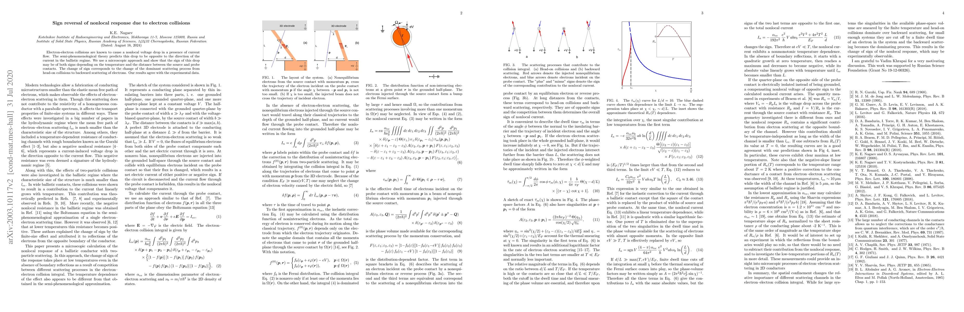 Electron-electron collisions are known to cause a nonlocal voltage drop in a presence of current flow. The semi-phenomenological theory predicts this drop to be opposite to the direction of the current in the ballistic regime. We use a microscopic approach and show that the sign of this drop may be of both signs depending on the temperature and the distance between the source and probe contacts. The change of sign corresponds to the change of the dominant scattering process from head-on collisions to backward scattering of electrons. Our results agree with the experimental data.