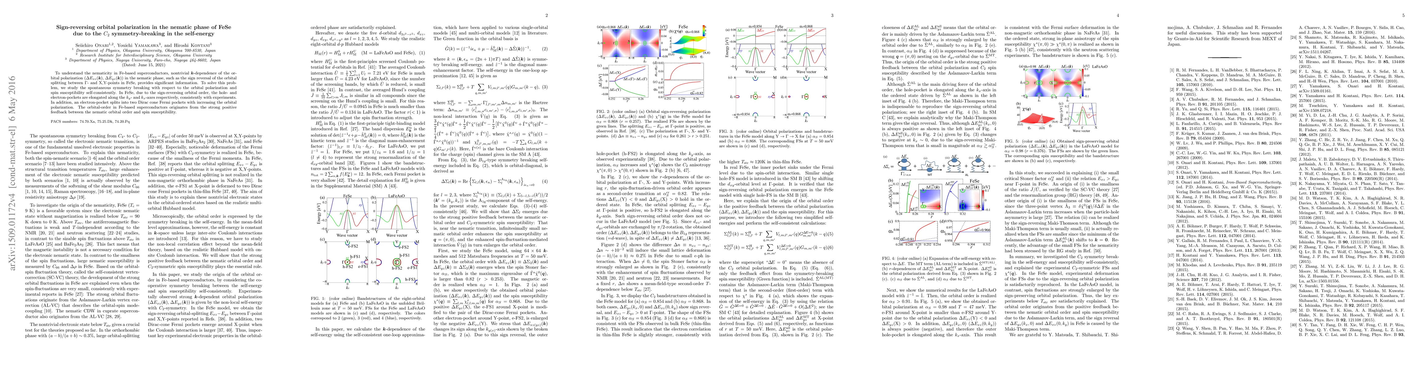 To understand the nematicity in Fe-based superconductors, nontrivial $k$-dependence of the orbital polarization ($\Delta E_{xz}(k)$, $\Delta E_{yz}(k)$) in the nematic phase, such as the sign reversal of the orbital splitting between $\Gamma$- and X,Y-points in FeSe, provides significant information. To solve this problem, we study the spontaneous symmetry breaking with respect to the orbital polarization and spin susceptibility self-consistently. In FeSe, due to the sign-reversing orbital order, the hole- and electron-pockets are elongated along the $k_y$- and $k_x$-axes respectively, consistently with experiments. In addition, an electron-pocket splits into two Dirac cone Fermi pockets with increasing the orbital polarization. The orbital-order in Fe-based superconductors originates from the strong positive feedback between the nematic orbital order and spin susceptibility.