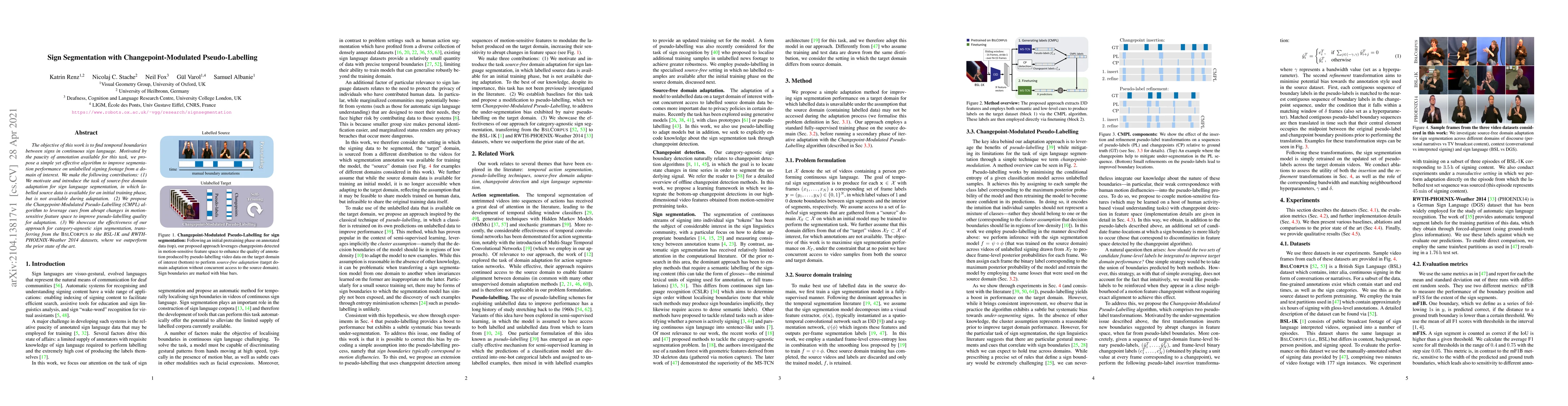 The objective of this work is to find temporal boundaries between signs in continuous sign language. Motivated by the paucity of annotation available for this task, we propose a simple yet effective algorithm to improve segmentation performance on unlabelled signing footage from a domain of interest. We make the following contributions: (1) We motivate and introduce the task of source-free domain adaptation for sign language segmentation, in which labelled source data is available for an initial training phase, but is not available during adaptation. (2) We propose the Changepoint-Modulated Pseudo-Labelling (CMPL) algorithm to leverage cues from abrupt changes in motion-sensitive feature space to improve pseudo-labelling quality for adaptation. (3) We showcase the effectiveness of our approach for category-agnostic sign segmentation, transferring from the BSLCORPUS to the BSL-1K and RWTH-PHOENIX-Weather 2014 datasets, where we outperform the prior state of the art.