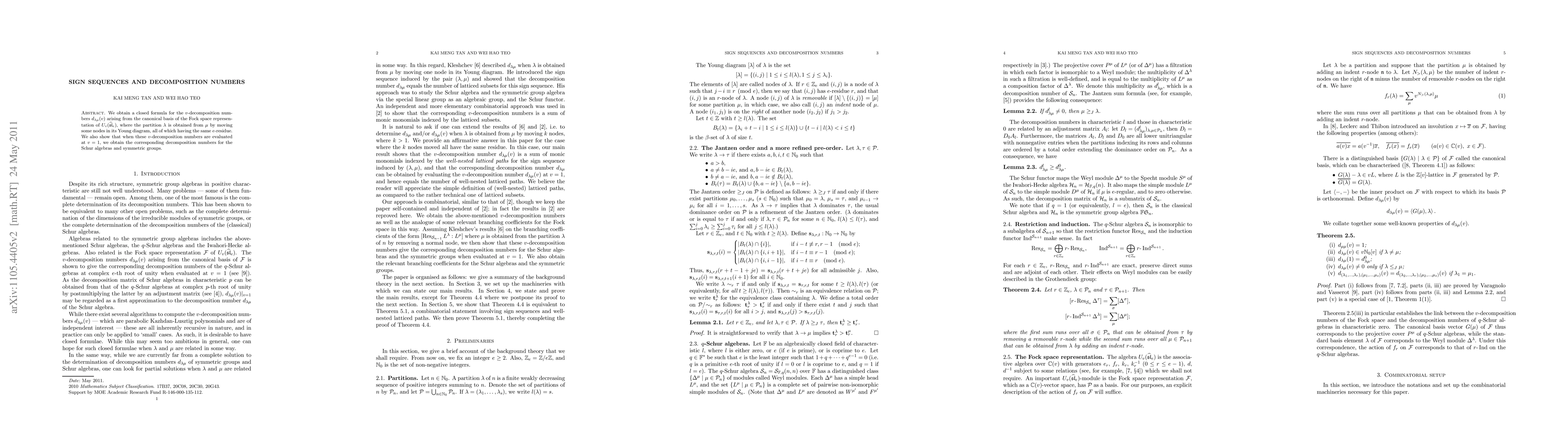 We obtain a closed formula for the $v$-decomposition numbers $d_{\lambda\mu}(v)$ arising from the canonical basis of the Fock space representation of $U_v(\hat{\mathfrak{sl}}_e)$, where the partition $\lambda$ is obtained from $\mu$ by moving some nodes in its Young diagram, all of which having the same $e$-residue. We also show that when these $v$-decomposition numbers are evaluated at $v=1$, we obtain the corresponding decomposition numbers for the Schur algebras and symmetric groups.
