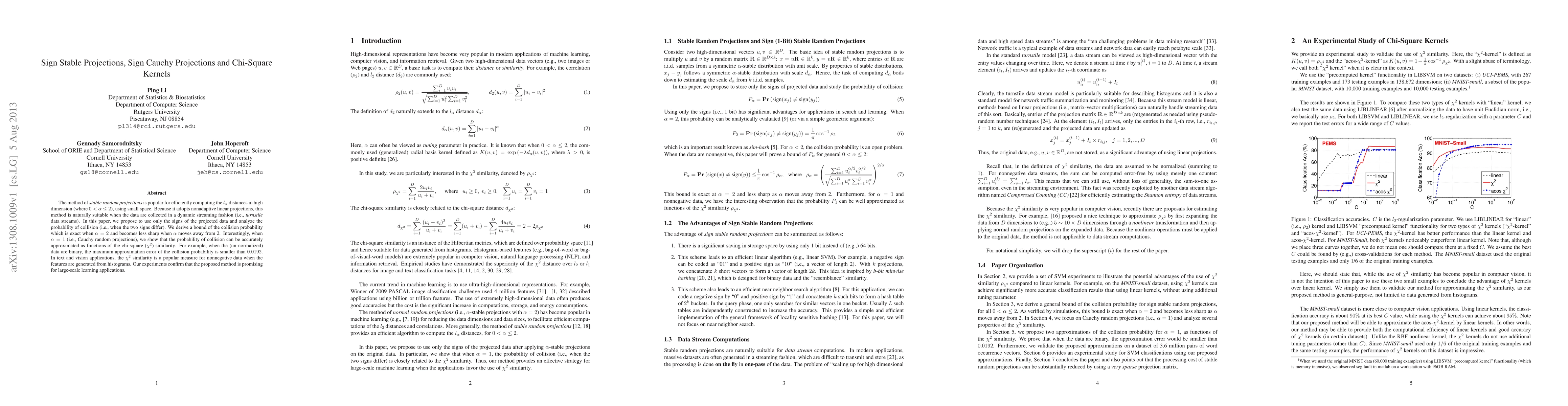 This paper proposes using sign stable projections to efficiently compute Lp distances in high-dimensional data streams, with a focus on analyzing collision probabilities. It shows that for p=2, the collision probability is exactly bounded, and for p=1 (Cauchy projections), it can be accurately approximated using chi-square similarity, especially for binary data.