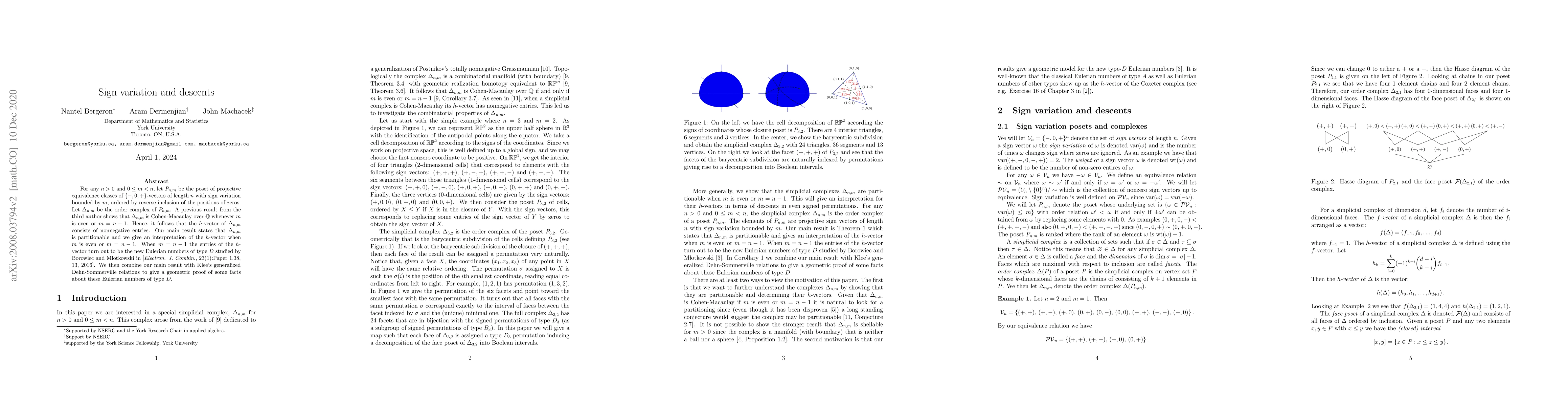 For any $n > 0$ and $0 \leq m < n$, let $P_{n,m}$ be the poset of projective equivalence classes of $\{-,0,+\}$-vectors of length $n$ with sign variation bounded by $m$, ordered by reverse inclusion of the positions of zeros. Let $\Delta_{n,m}$ be the order complex of $P_{n,m}$. A previous result from the third author shows that $\Delta_{n,m}$ is Cohen-Macaulay over $\mathbb{Q}$ whenever $m$ is even or $m = n-1$. Hence, it follows that the $h$-vector of $\Delta_{n,m}$ consists of nonnegative entries. Our main result states that $\Delta_{n,m}$ is partitionable and we give an interpretation of the $h$-vector when $m$ is even or $m = n-1$. When $m = n-1$ the entries of the $h$-vector turn out to be the new Eulerian numbers of type $D$ studied by Borowiec and M\l otkowski in [{\em Electron. J. Combin.}, 23(1):Paper 1.38, 13, 2016]. We then combine our main result with Klee's generalized Dehn-Sommerville relations to give a geometric proof of some facts about these Eulerian numbers of type $D$.