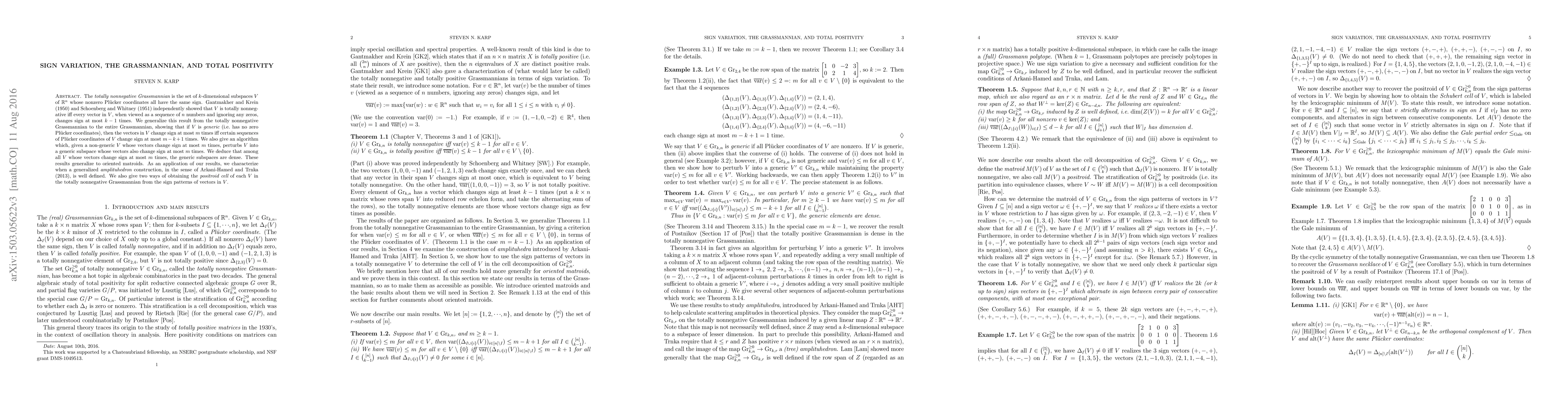 The research paper explores the relationship between sign variation in subspaces and total positivity, showing that generic subspaces have a specific property related to sign changes, and introduces an algorithm to perturb non-generic subspaces into the desired form.