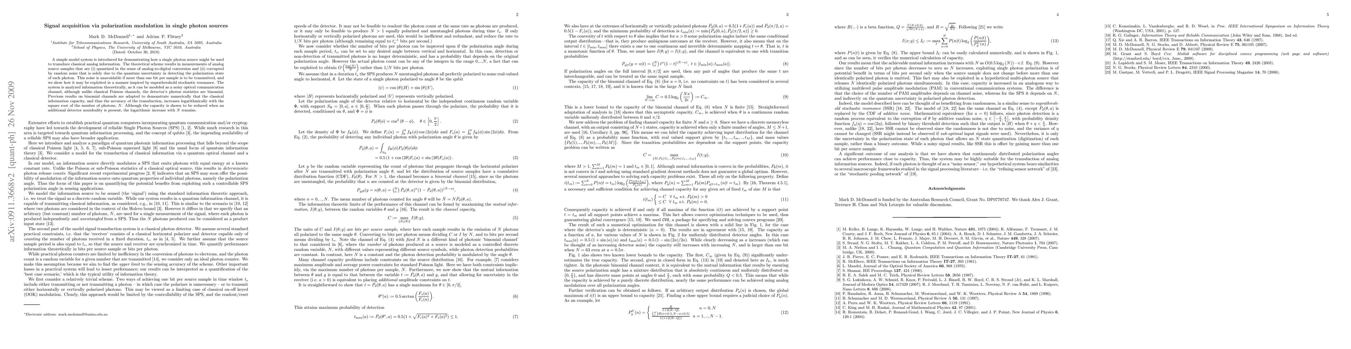 A simple model system is introduced for demonstrating how a single photon source might be used to transduce classical analog information. The theoretical scheme results in measurements of analog source samples that are (i) quantized in the sense of analog-to-digital conversion and (ii) corrupted by random noise that is solely due to the quantum uncertainty in detecting the polarization state of each photon. This noise is unavoidable if more than one bit per sample is to be transmitted, and we show how it may be exploited in a manner inspired by suprathreshold stochastic resonance. The system is analyzed information theoretically, as it can be modeled as a noisy optical communication channel, although unlike classical Poisson channels, the detector's photon statistics are binomial. Previous results on binomial channels are adapted to demonstrate numerically that the classical information capacity, and thus the accuracy of the transduction, increases logarithmically with the square root of the number of photons, N. Although the capacity is shown to be reduced when an additional detector nonideality is present, the logarithmic increase with N remains.