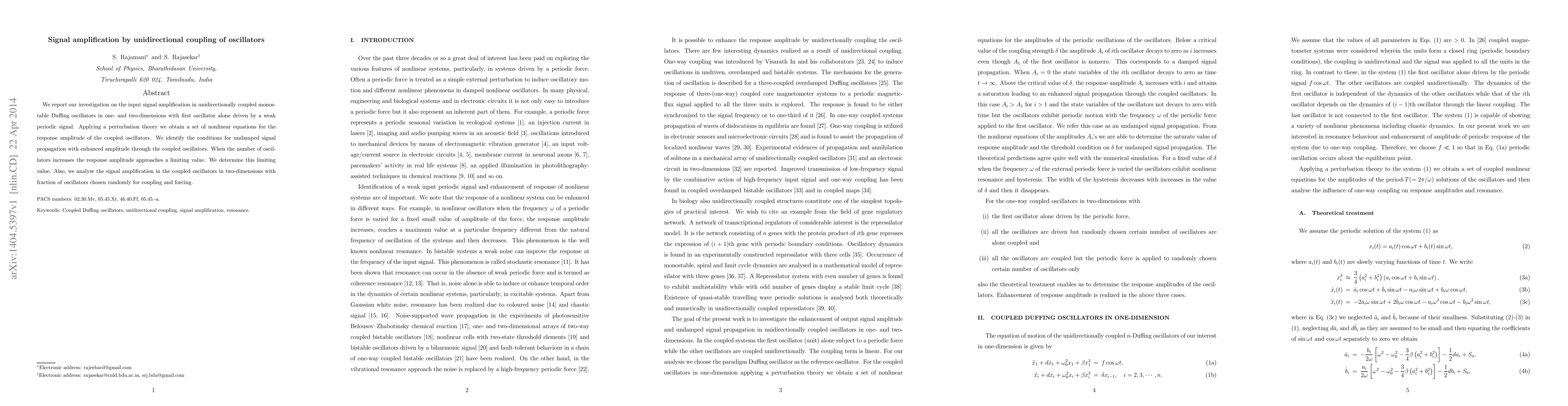 This paper explores signal amplification in unidirectionally coupled monostable Duffing oscillators, deriving nonlinear equations for response amplitude and identifying conditions for undamped signal propagation. The study finds that as the number of oscillators increases, the response amplitude approaches a limiting value, which is determined and analyzed in both one- and two-dimensional configurations.