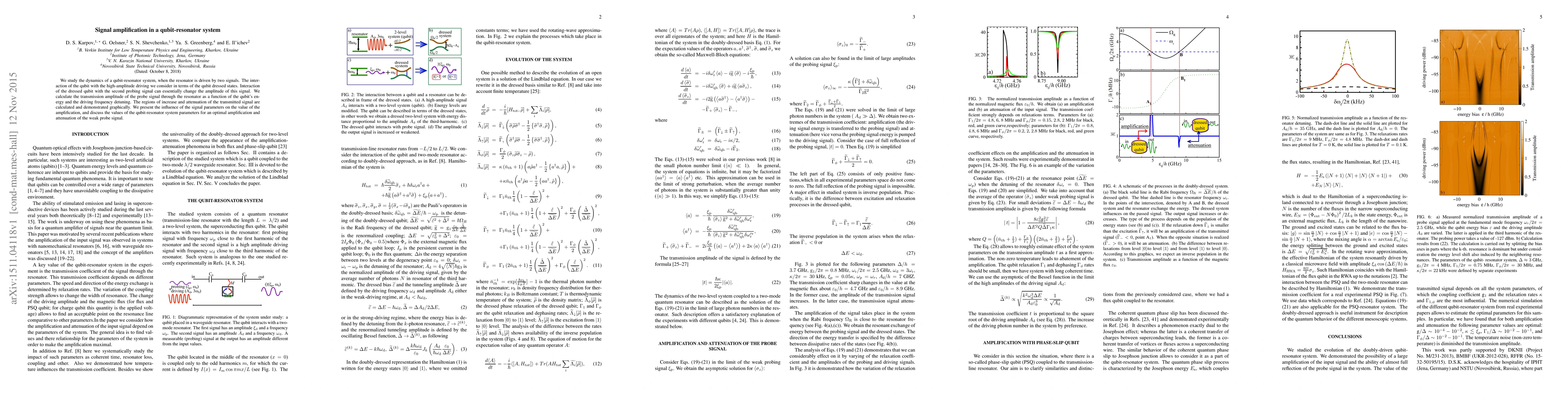 This paper investigates the dynamics of a qubit-resonator system driven by two signals, focusing on how the qubit's dressed states interact with a high-amplitude driving signal and a probing signal. It calculates the transmission amplitude of the probe signal, identifying regions of signal amplification and attenuation, and discusses optimal system parameters for signal manipulation.