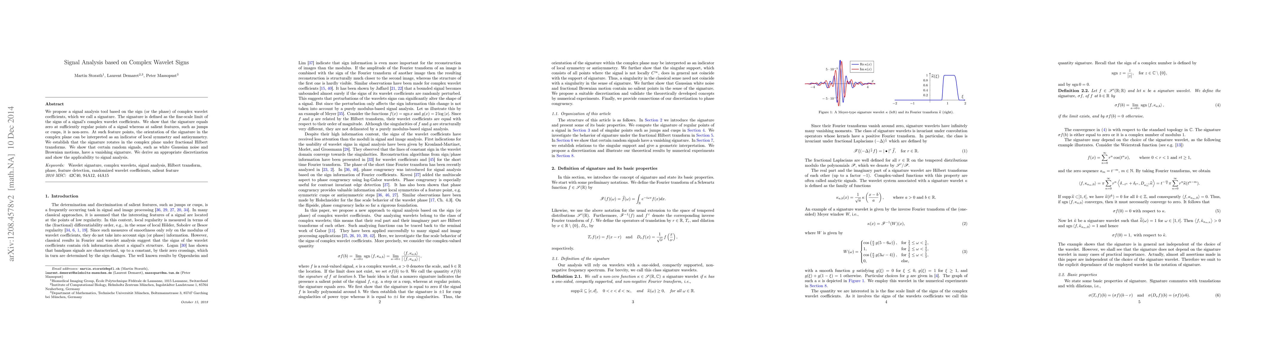 This paper introduces a novel signal analysis method based on the signs of complex wavelet coefficients, termed the "signature," which highlights salient features like jumps or cusps. The signature's orientation in the complex plane indicates local symmetry and antisymmetry, and it rotates under fractional Hilbert transforms, while random signals like white Gaussian noise have a vanishing signature.