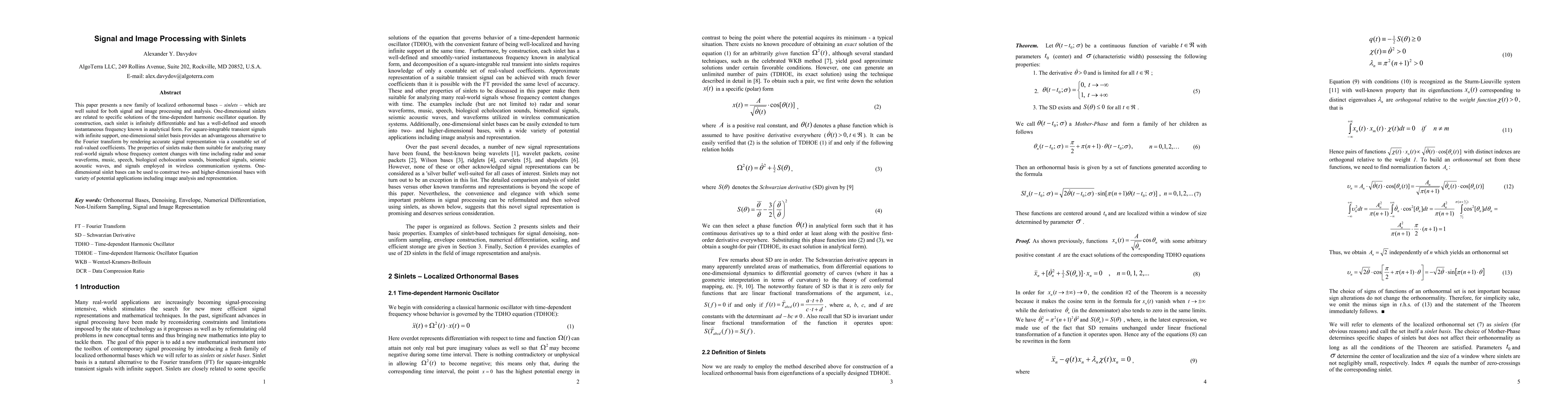 A new family of sinlets is proposed for signal and image processing, offering a localized orthonormal basis with improved accuracy for signals with changing frequency content. This method provides an alternative to Fourier transform for representing signals using real-valued coefficients.