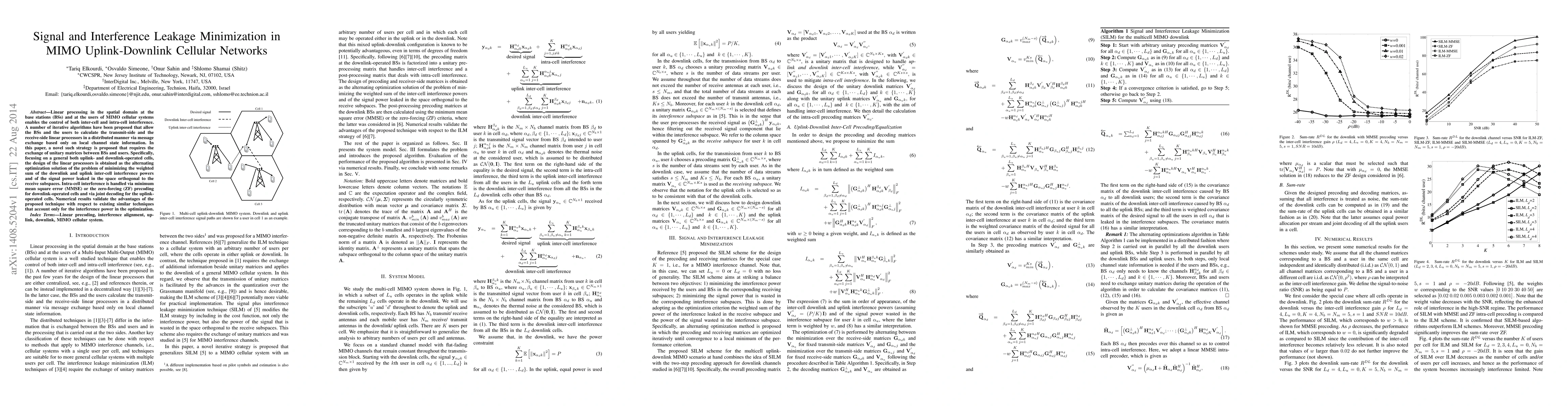 This paper proposes a novel iterative algorithm for minimizing signal leakage and interference in MIMO cellular networks, utilizing unitary matrix exchanges between base stations and users. The method optimizes linear processors to reduce both inter-cell and intra-cell interference, validated by numerical results showing superior performance compared to existing techniques.