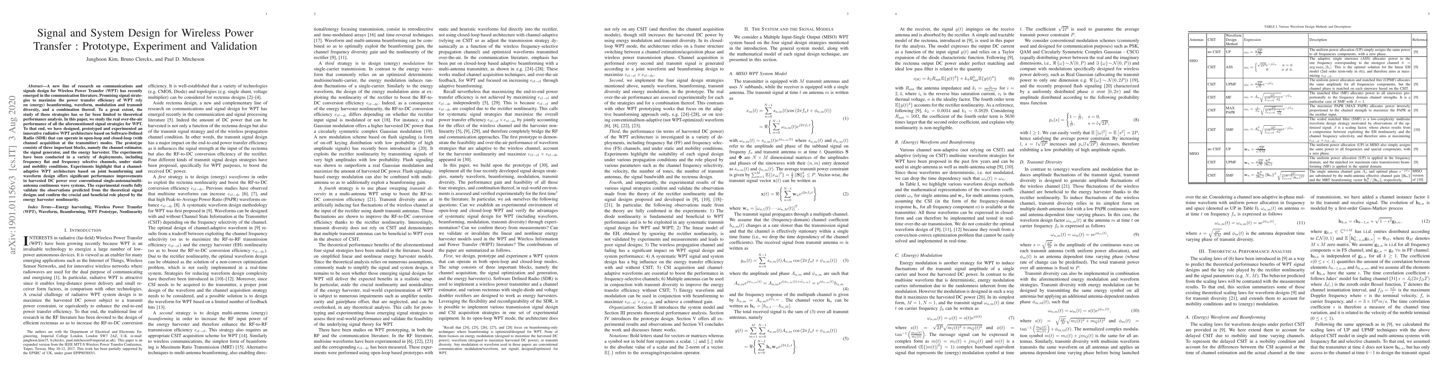 A new line of research on communications and signals design for Wireless Power Transfer (WPT) has recently emerged in the communication literature. Promising signal strategies to maximize the power transfer efficiency of WPT rely on (energy) beamforming, waveform, modulation and transmit diversity, and a combination thereof. To a great extent, the study of those strategies has so far been limited to theoretical performance analysis. In this paper, we study the real over-the-air performance of all the aforementioned signal strategies for WPT. To that end, we have designed, prototyped and experimented an innovative radiative WPT architecture based on Software-Defined Radio (SDR) that can operate in open-loop and closed-loop (with channel acquisition at the transmitter) modes. The prototype consists of three important blocks, namely the channel estimator, the signal generator, and the energy harvester. The experiments have been conducted in a variety of deployments, including frequency flat and frequency selective channels, under static and mobility conditions. Experiments highlight that a channeladaptive WPT architecture based on joint beamforming and waveform design offers significant performance improvements in harvested DC power over conventional single-antenna/multiantenna continuous wave systems. The experimental results fully validate the observations predicted from the theoretical signal designs and confirm the crucial and beneficial role played by the energy harvester nonlinearity.